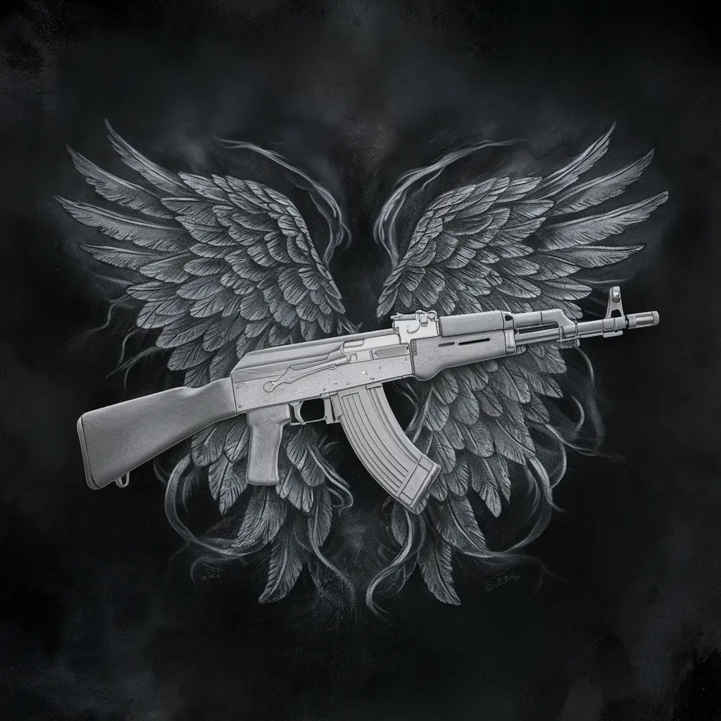 Imagine the AK47 surrounded by majestic wings, either angelic or eagle-like. This combination symbolizes freedom, power, and transcendence, creating a beautiful contrast between strength and liberty.
