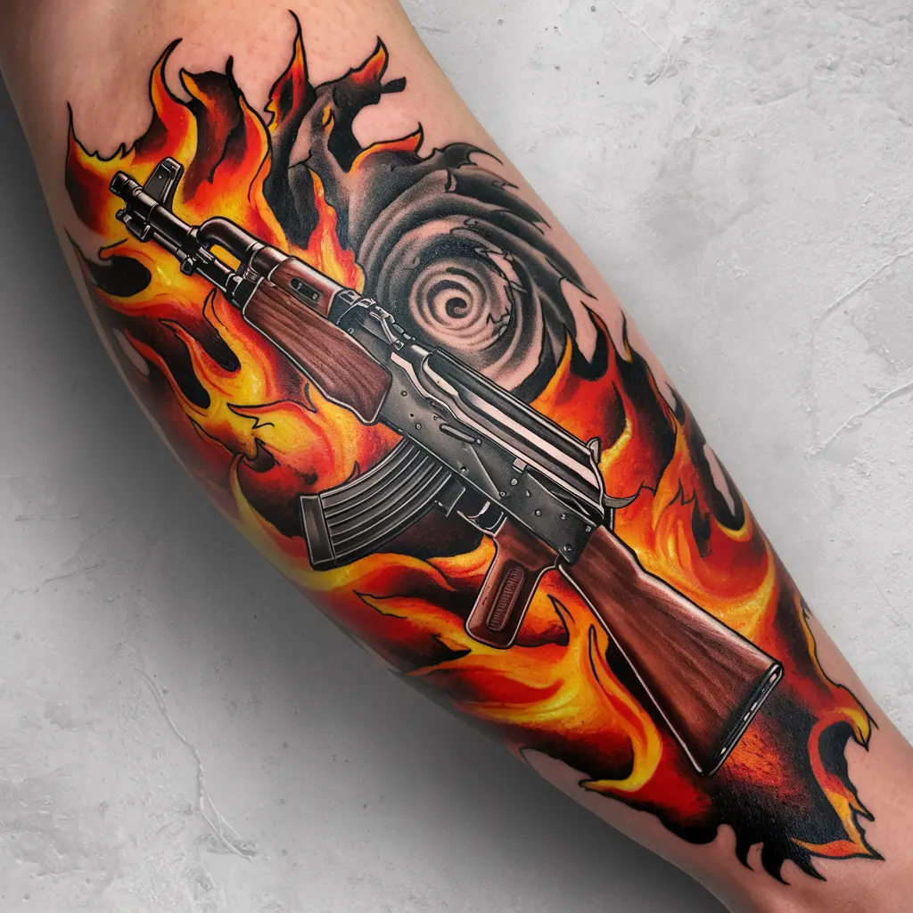Who doesn’t love a tattoo that makes a statement? An AK47 tattoo surrounded by flames symbolizes intense power and destruction. It’s a design that showcases the sheer force of both the weapon and the fire surrounding it.