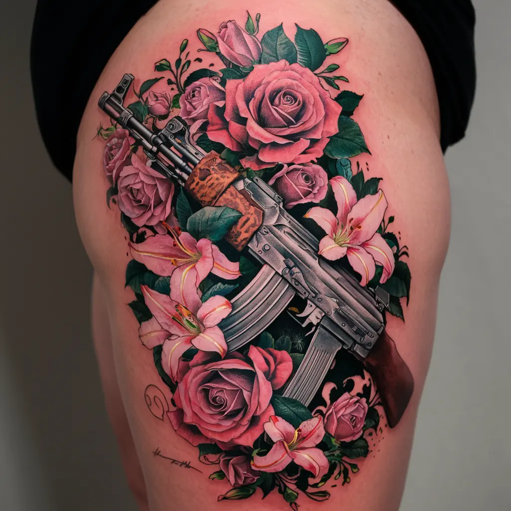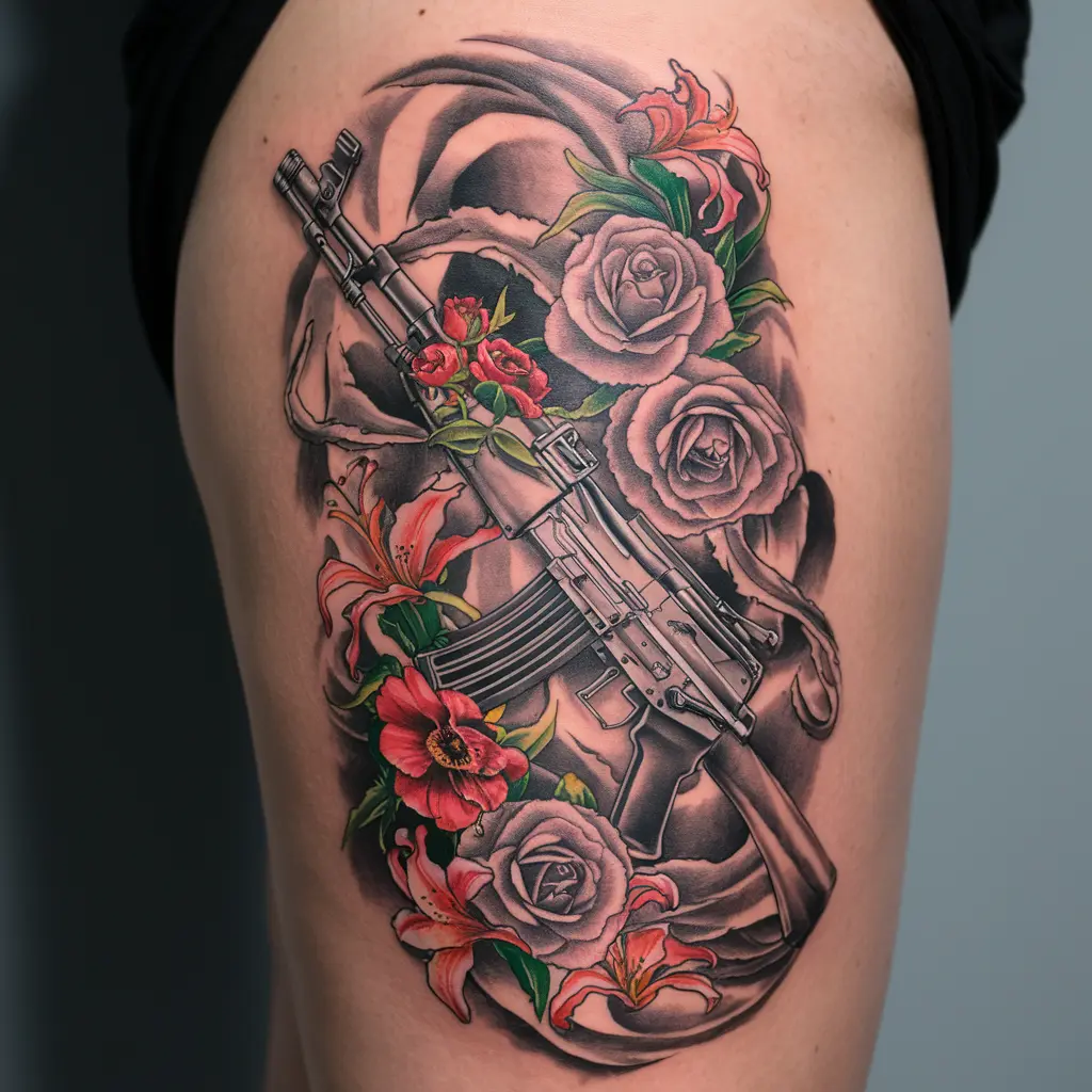 Contrast is a beautiful thing. Imagine an AK47 that is intertwined with flowers like roses, lilies, or any other blooms that catch your eye. The combination of something fierce with something delicate brings a beautiful balance to the tattoo.