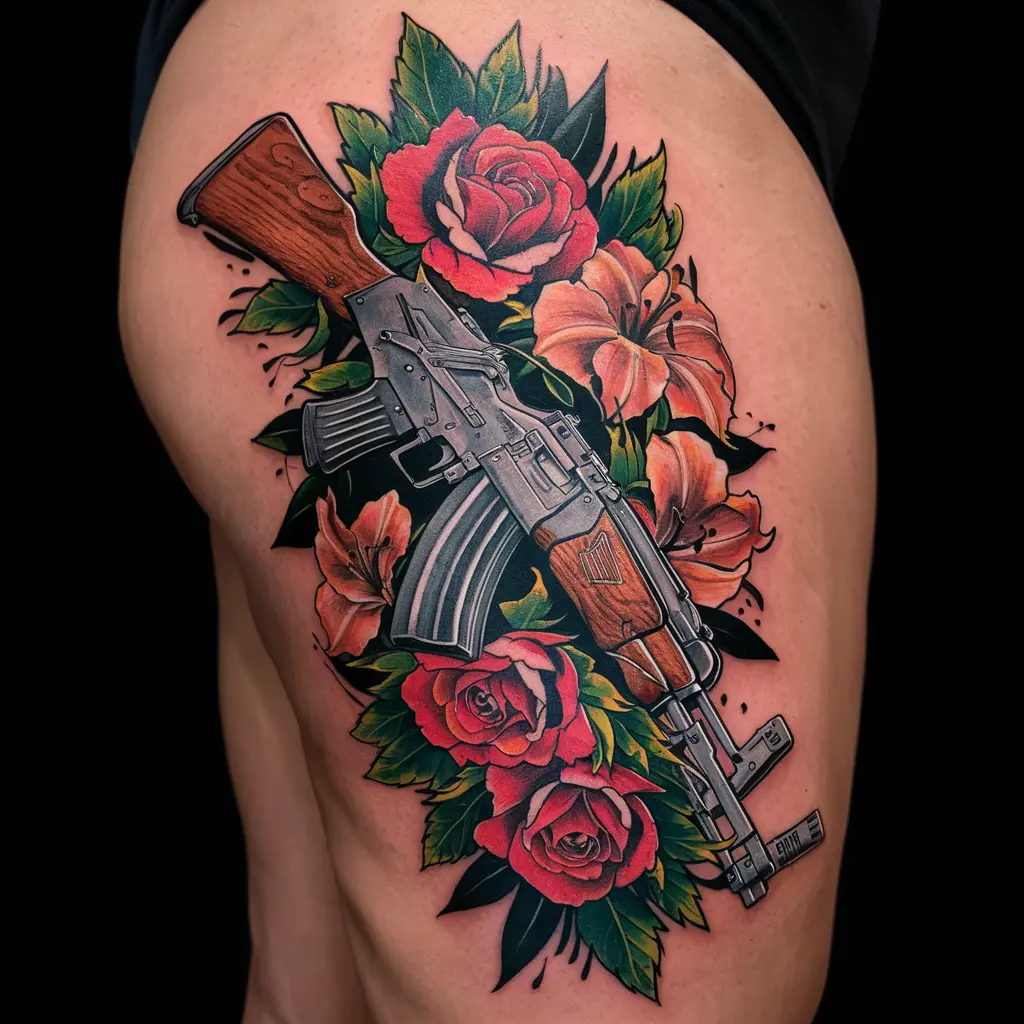 A neo-traditional AK47 tattoo combines vintage aesthetics with bold, graphic lines. The use of vibrant colors and sharp details adds a timeless touch to the design.