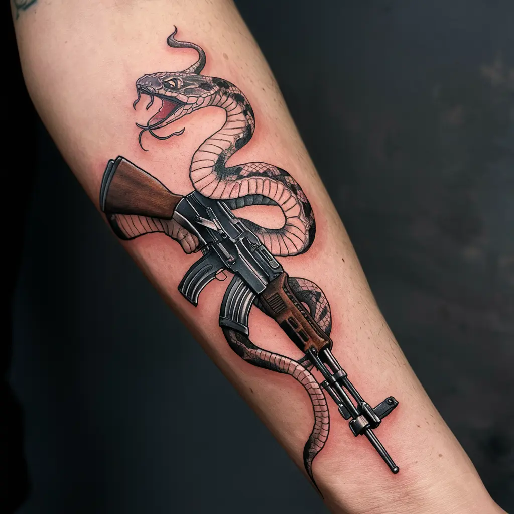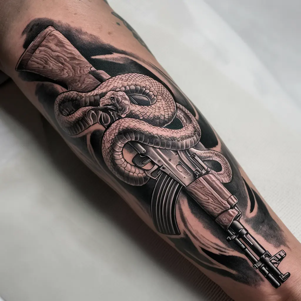 Placement: The best places for this tattoo are on the arm, leg, or spine, where the snake can coil around the AK47 to create movement and flow.