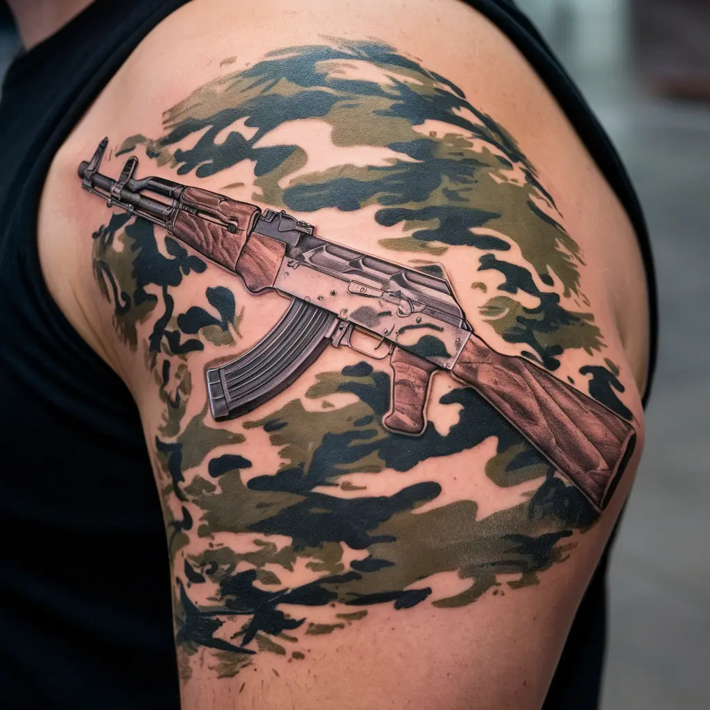 Placement: The thigh, upper arm, or back would be great placements for a camouflage AK47 tattoo, as the design works well with larger, flat areas.