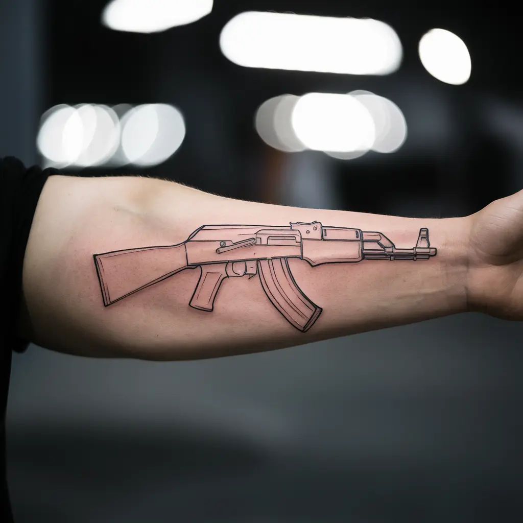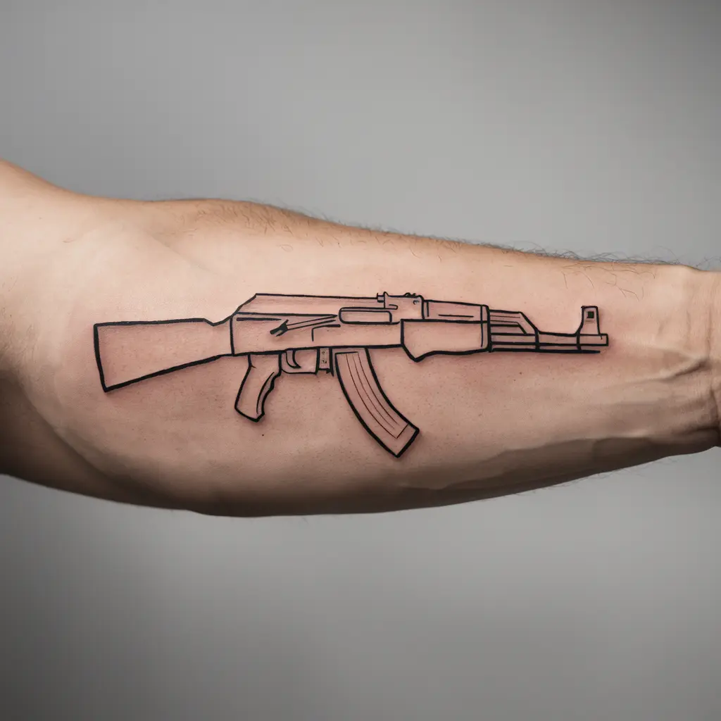 Tattoo Meaning: If you’re someone who loves clean and simple designs, a minimalist AK47 outline might be perfect for you. This tattoo showcases just the basic shape of the AK47, using fine lines without too much detail.