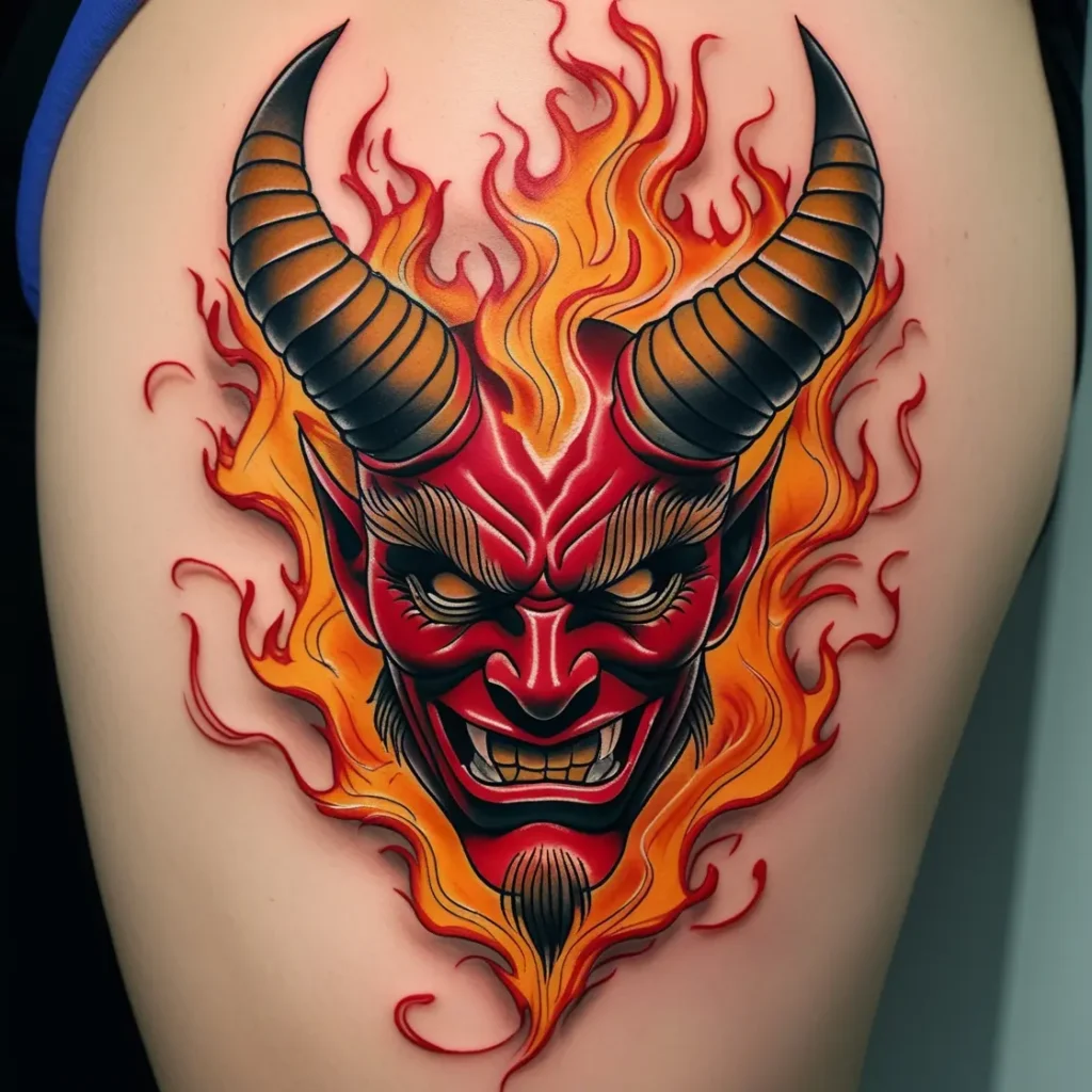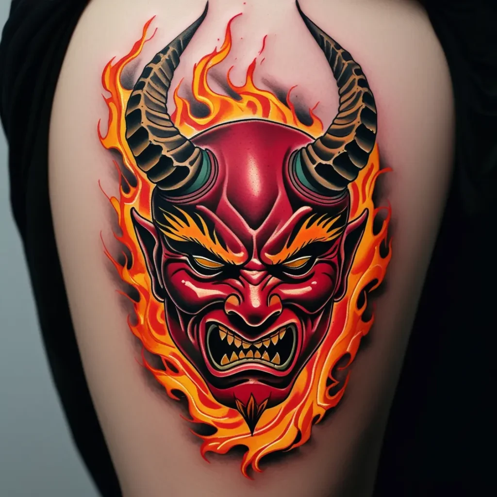 The Hannya mask is often used in traditional Japanese Noh theater and represents a female demon driven by intense emotions, particularly jealousy and rage. It’s an intense, striking design that symbolizes raw emotion.