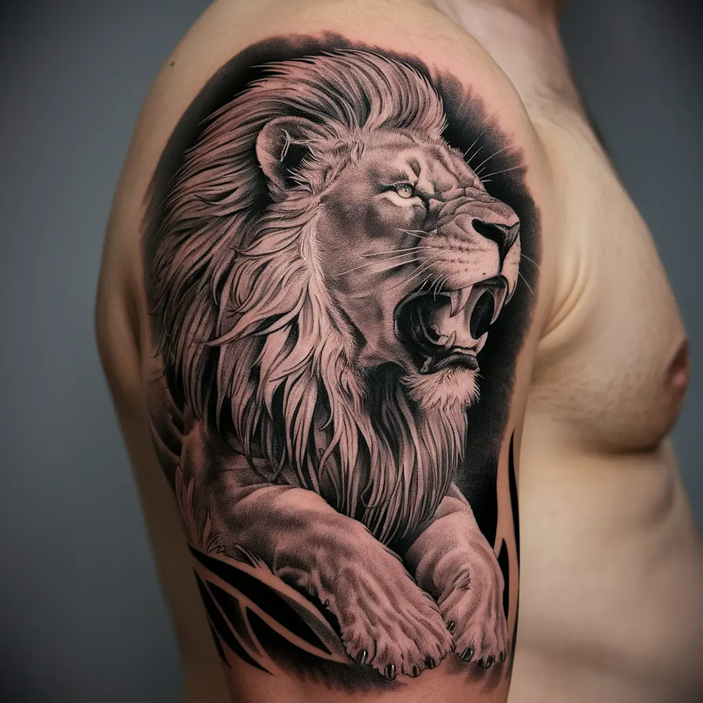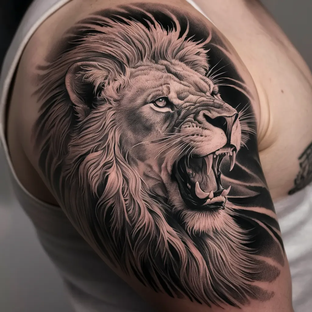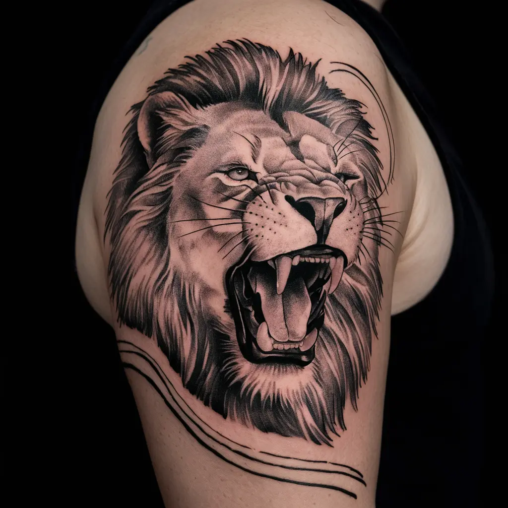 Personalized Description: An animal portrait tattoo on the upper arm, such as a lion, wolf, or eagle, can showcase your love for a particular creature. These designs focus on fine details, bringing the animal to life with realistic shading and textures.