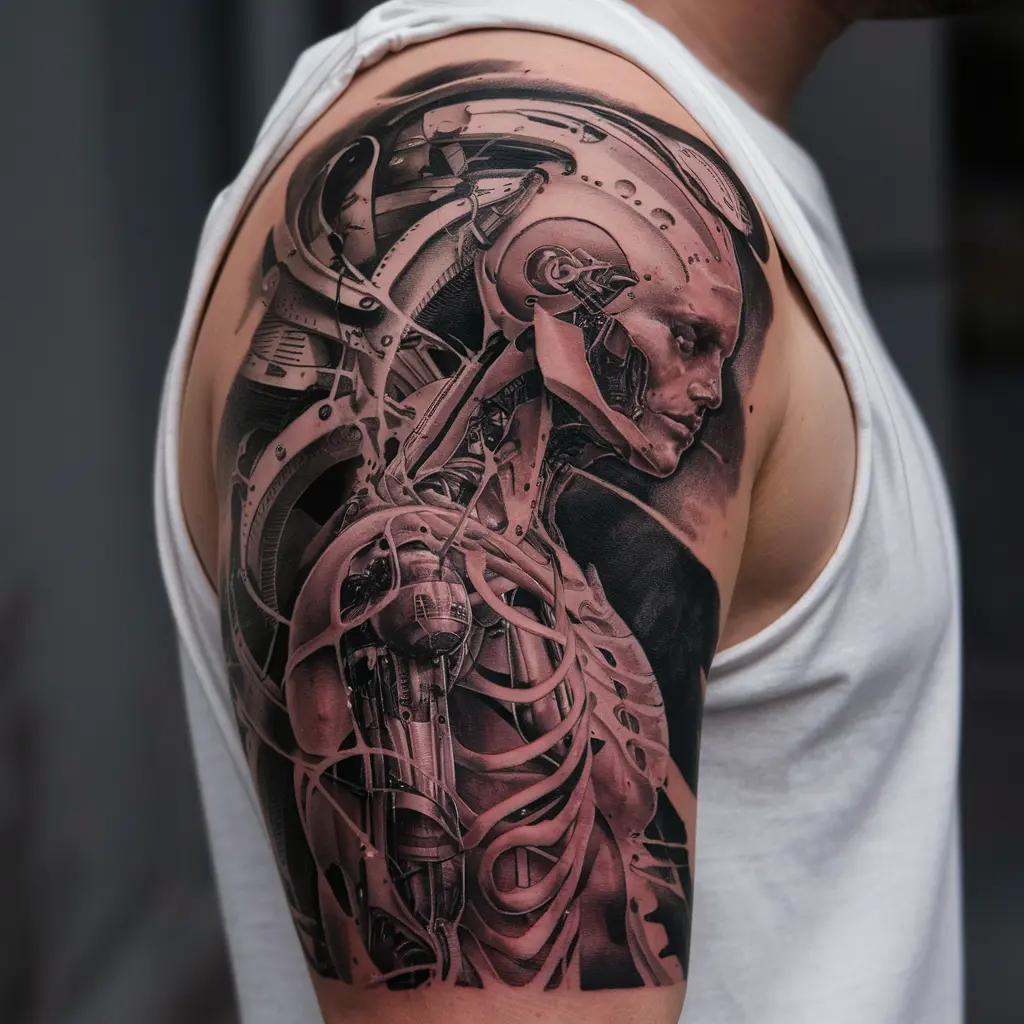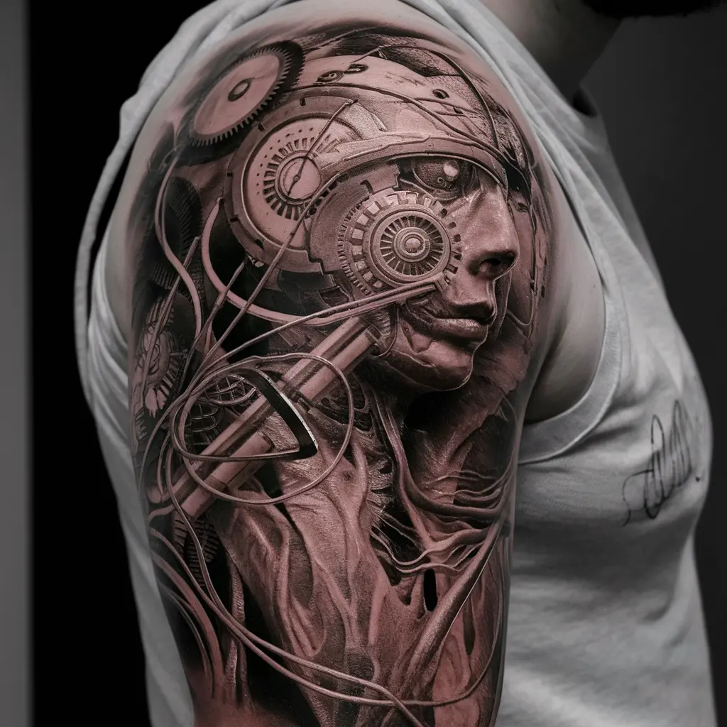 Personalized Description: A biomechanical tattoo blends mechanical parts with human anatomy, often creating a futuristic, robotic appearance. The upper arm is an excellent canvas for this creative style.