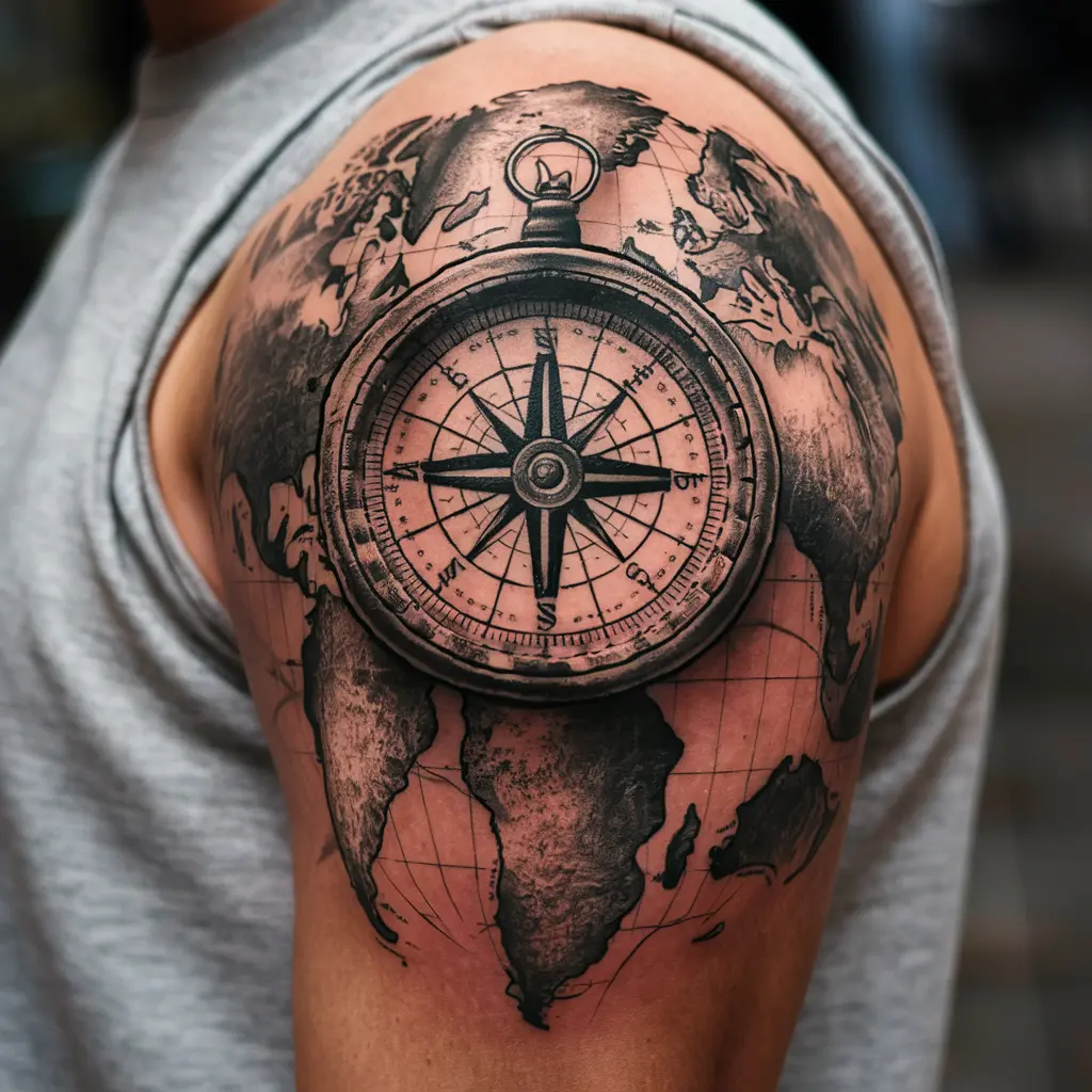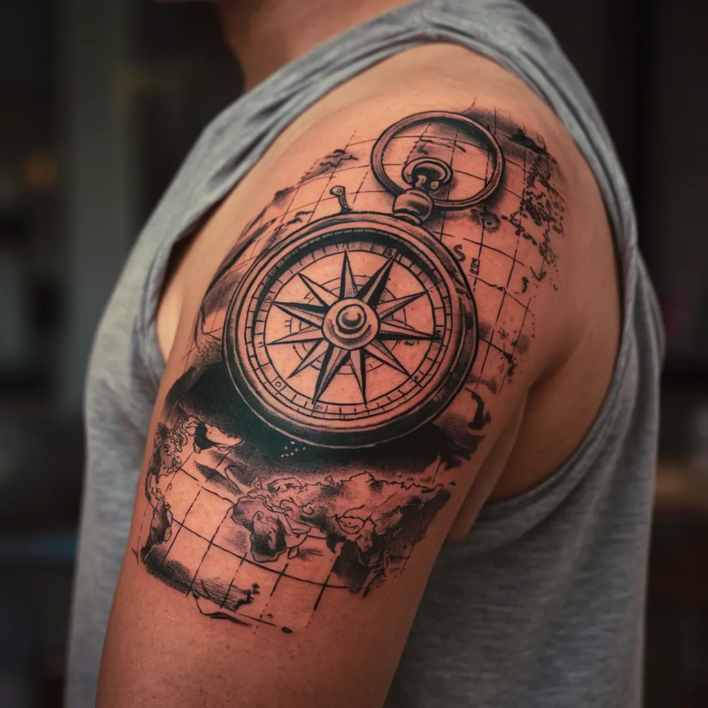 Personalized Description: A compass combined with a map design can symbolize direction and adventure. The upper arm provides enough space to make this tattoo detailed and meaningful.