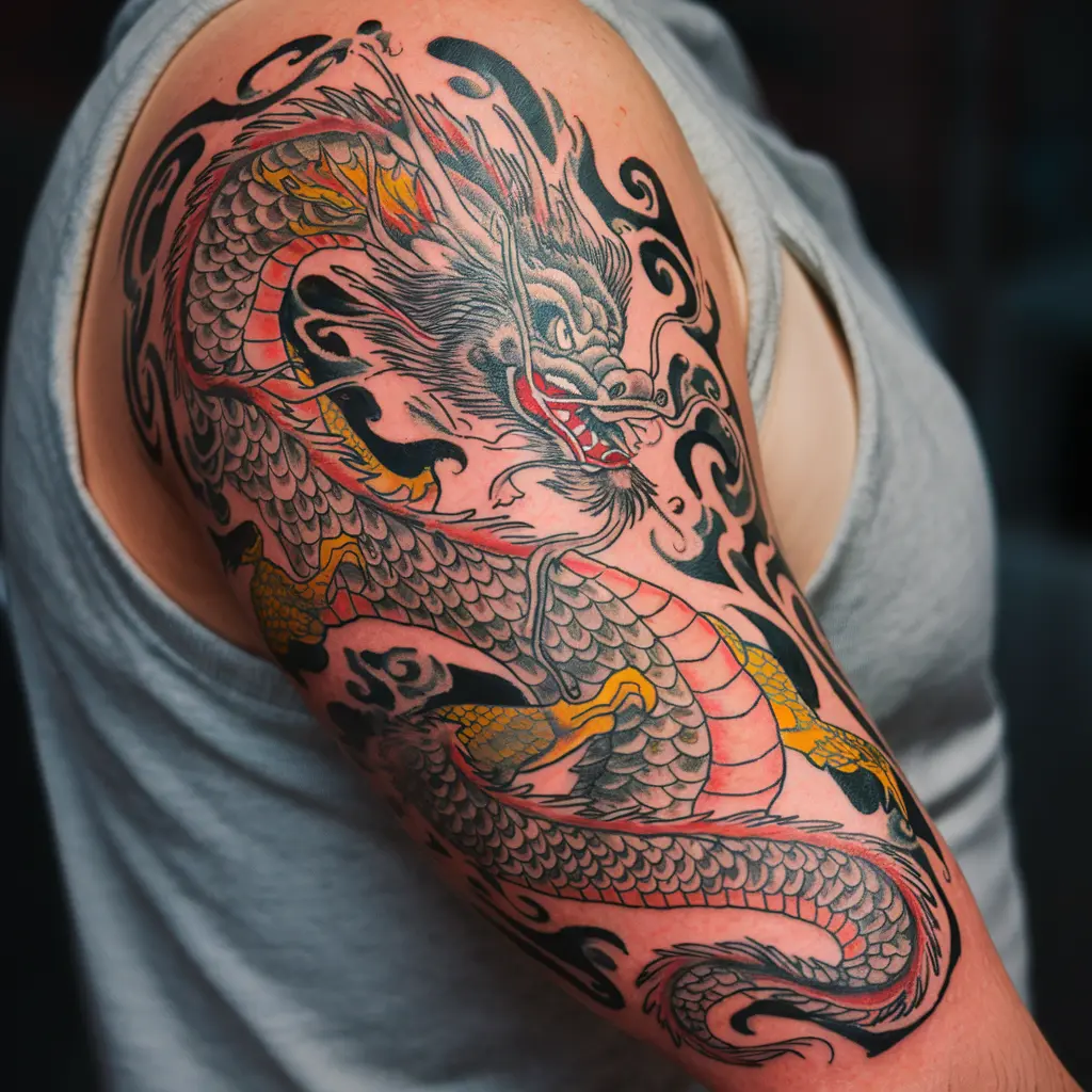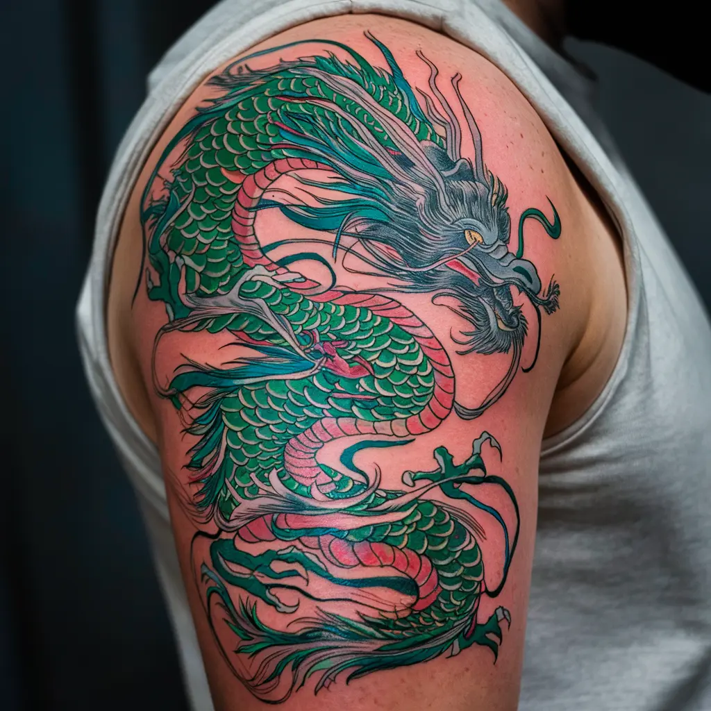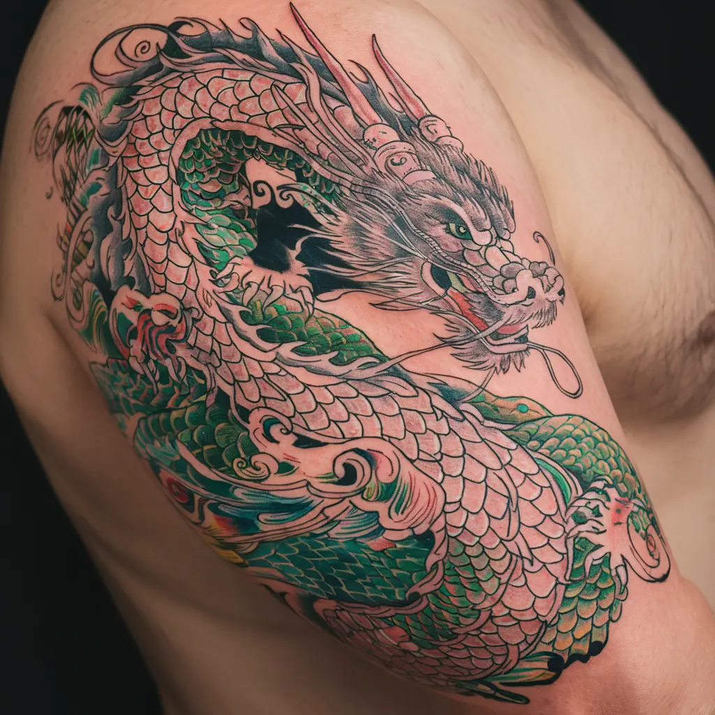 Personalized Description: A Japanese dragon tattoo is known for its intricate detailing and vibrant colors. These dragons often wrap around the arm, creating a sense of movement and energy.