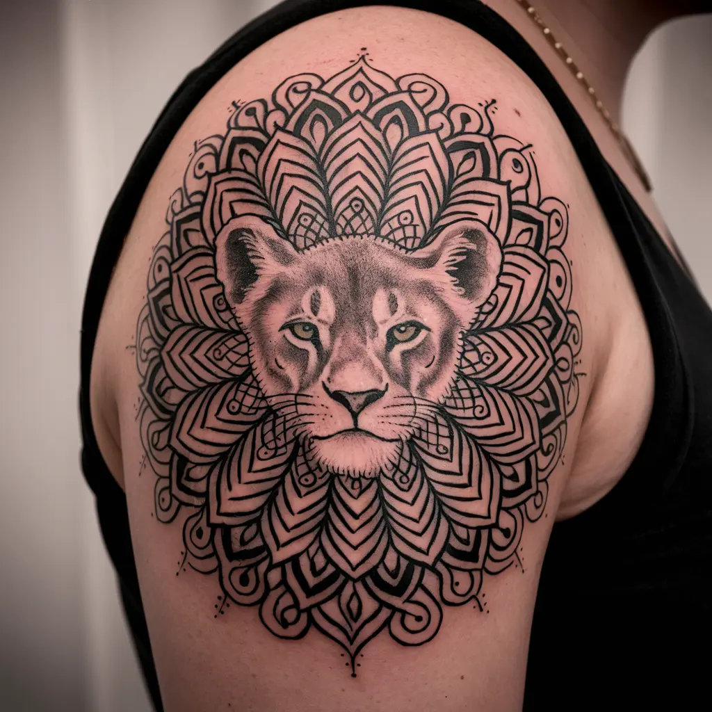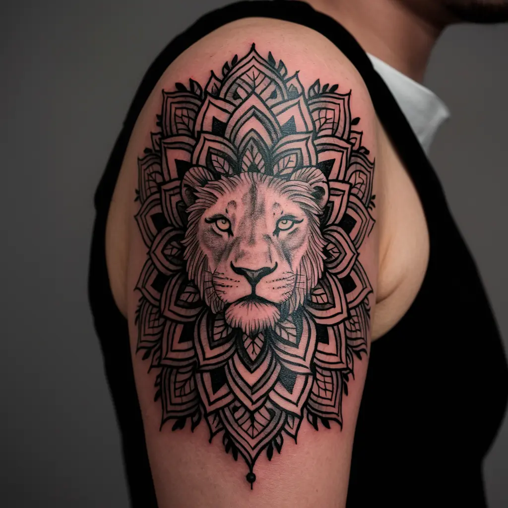 Personalized Description: A lion’s face surrounded by a mandala pattern combines strength and spirituality. The upper arm is the perfect placement for this detailed design