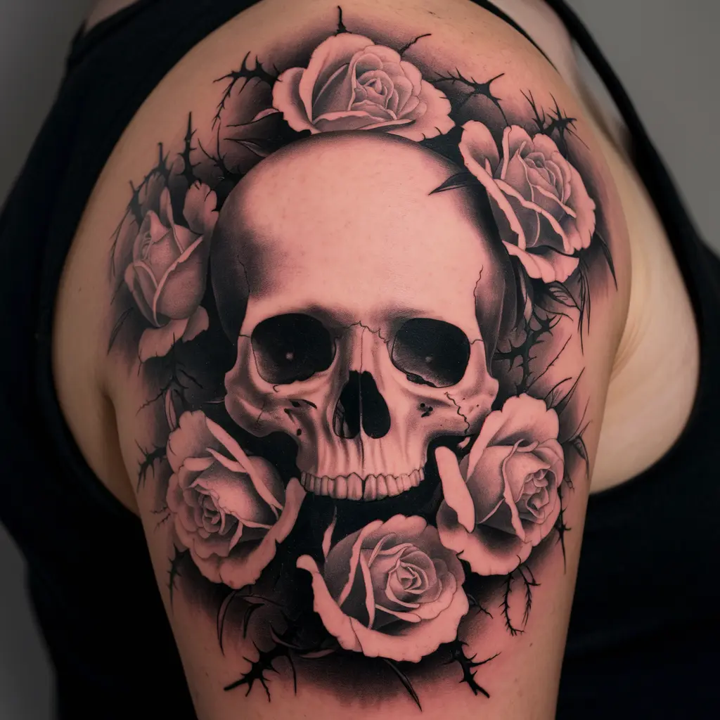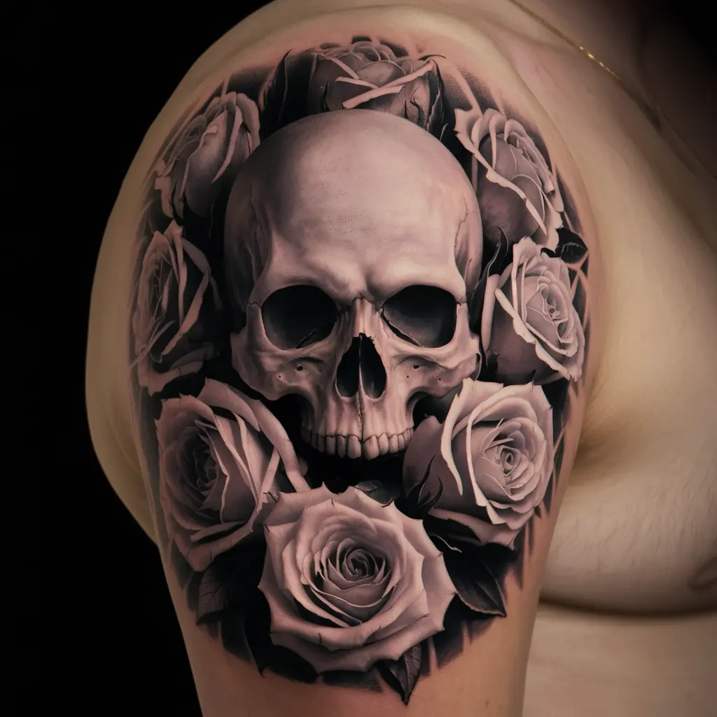 Tattoo Meaning: Skulls symbolize mortality and the transient nature of life, while roses often represent love and beauty. Together, they reflect the duality of life and death.