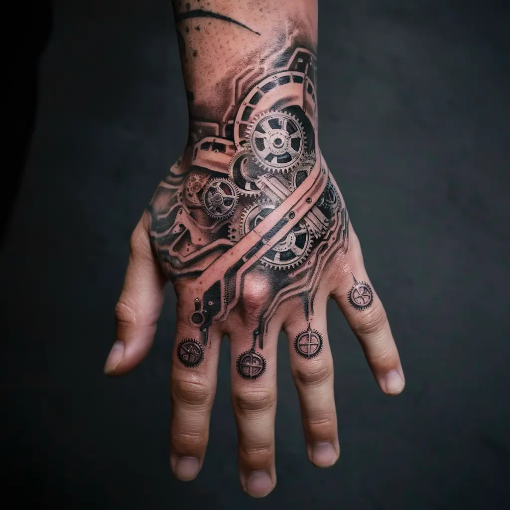 Biomechanical tattoos have a futuristic, robotic vibe, blending human anatomy with mechanical elements. A full hand biomechanical tattoo can cover the back of the hand and wrist, giving the appearance of metal and skin fused together.