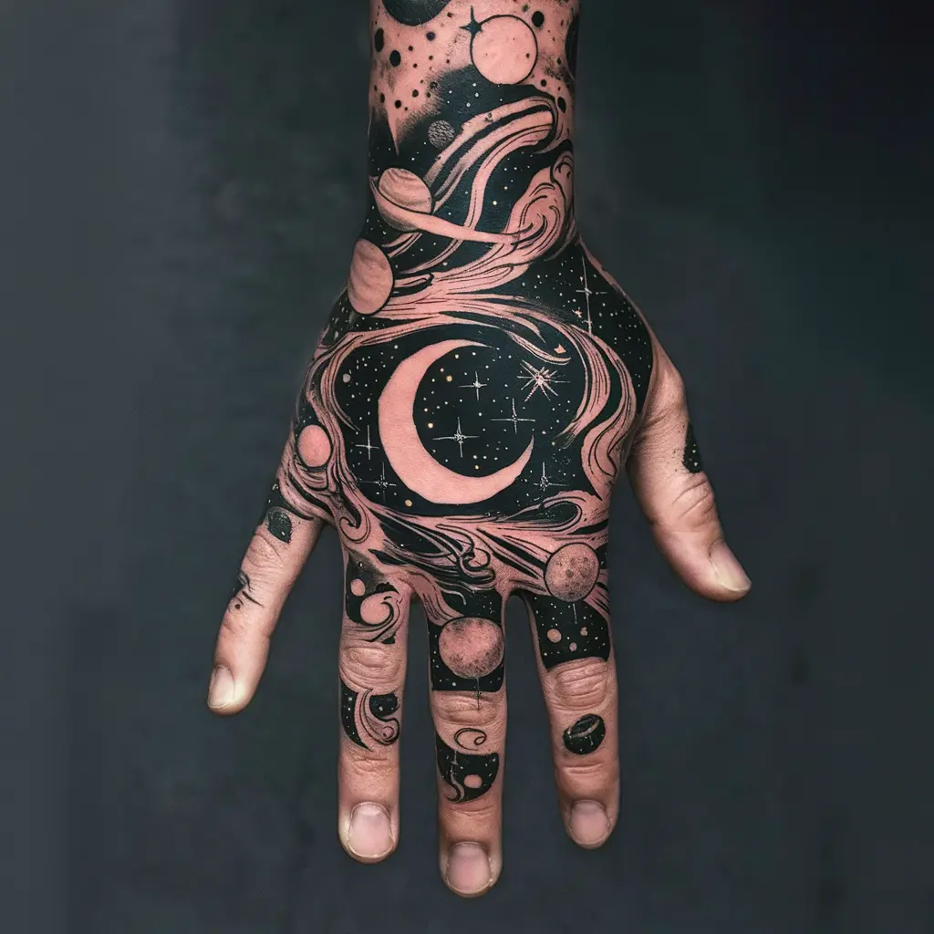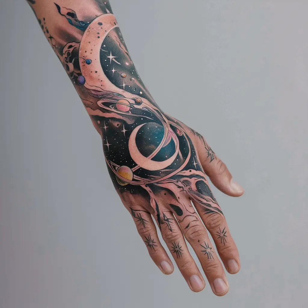 A celestial tattoo is perfect if you feel connected to the stars, planets, and the mysteries of the universe. This tattoo can feature a moon, stars, and planets, with swirling lines that wrap from the wrist to the back of the hand, creating a cosmic feel.