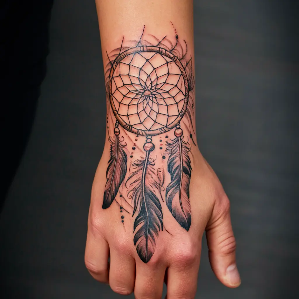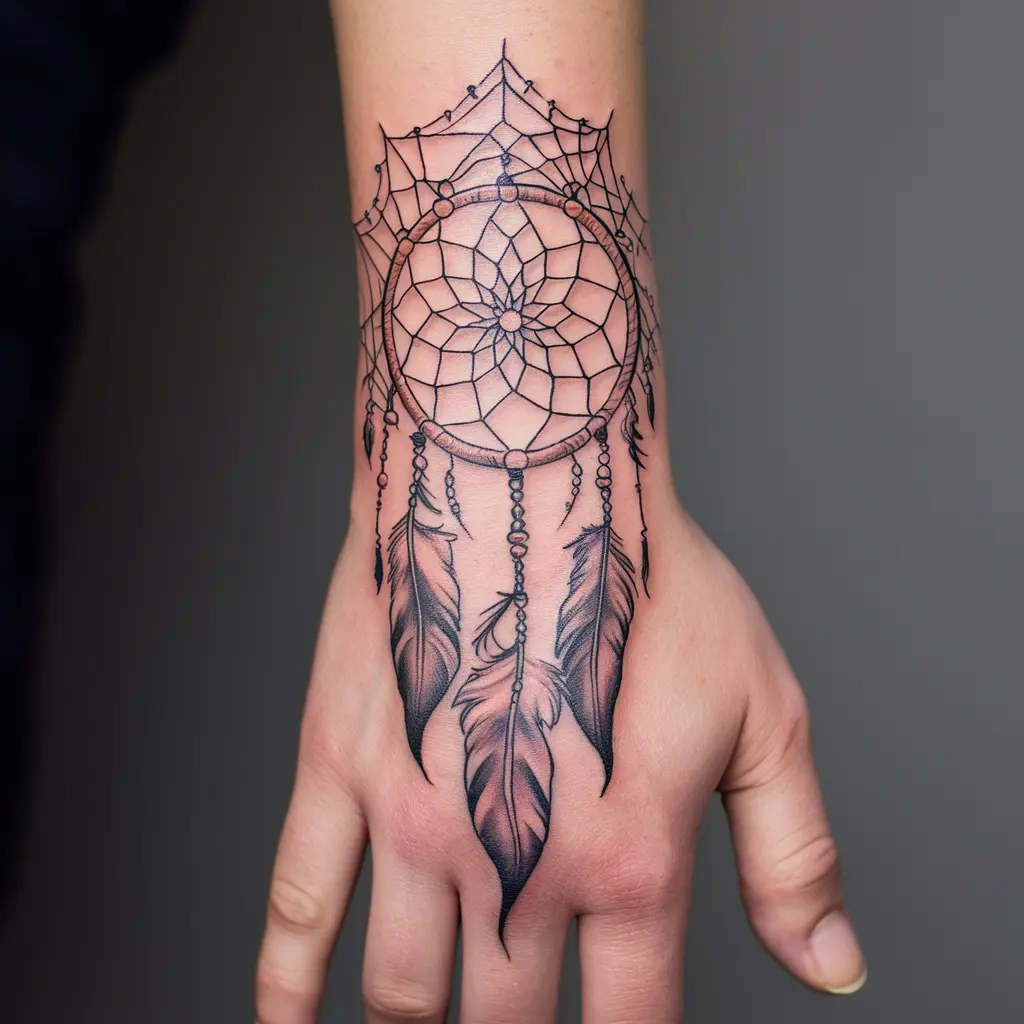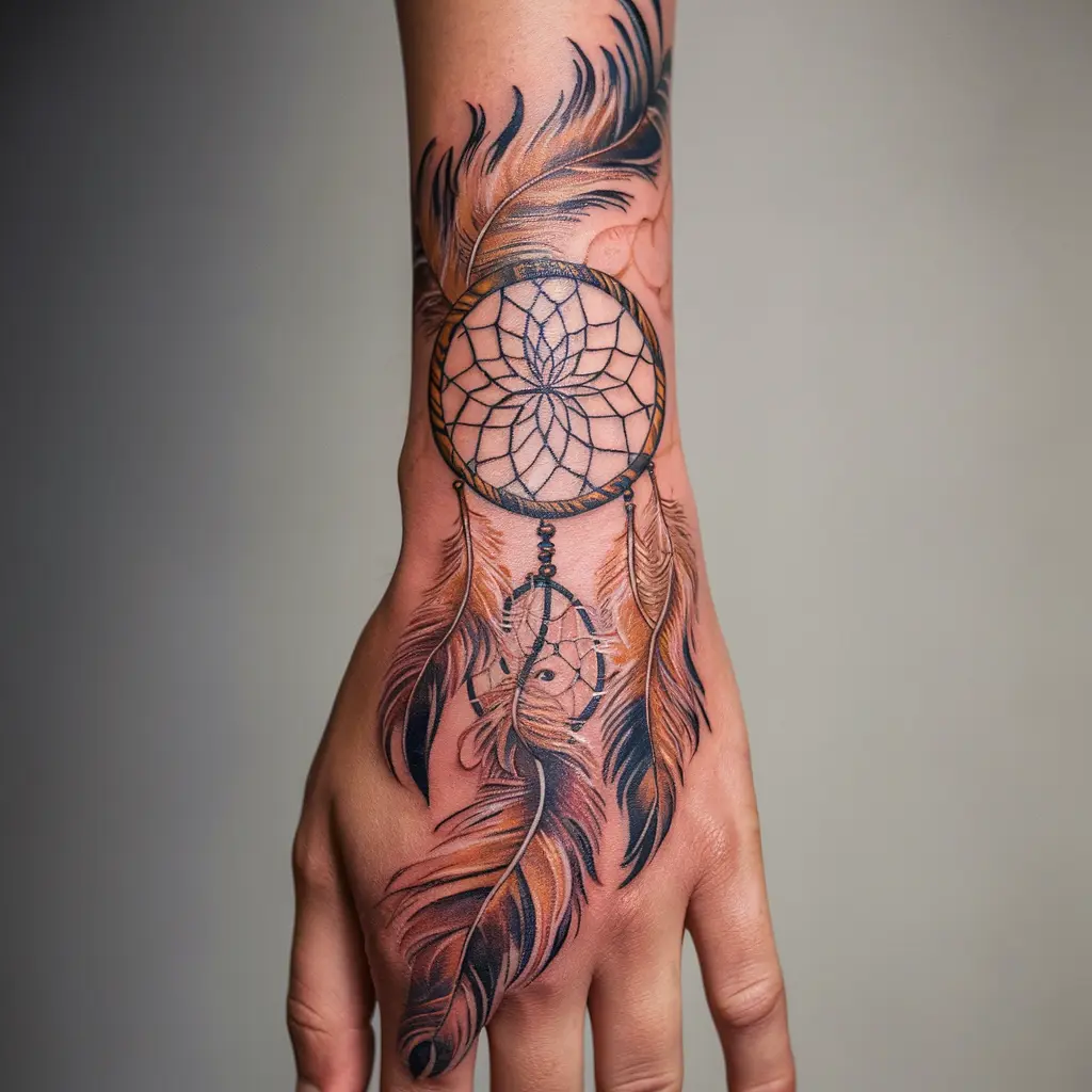 Placement: Dreamcatcher on the wrist, with feathers flowing over the hand and fingers.
