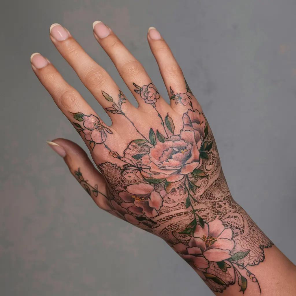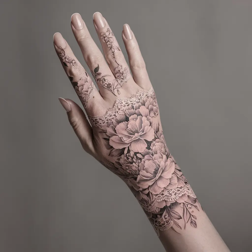 Floral tattoos are timeless, and when paired with delicate lacework, the design becomes even more feminine and elegant. A lace-inspired floral pattern can be tattooed from the fingers to the wrist, wrapping beautifully around the hand like a piece of intricate jewelry.