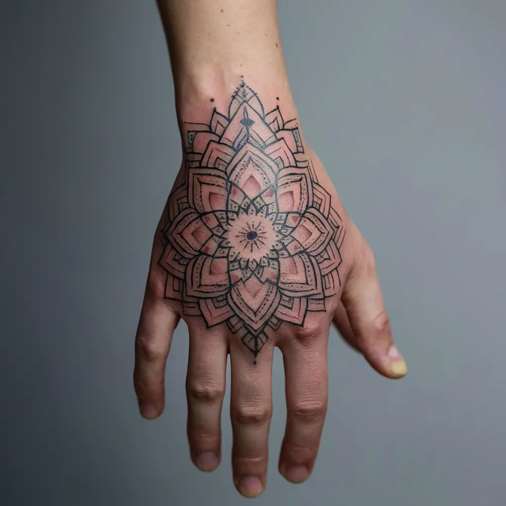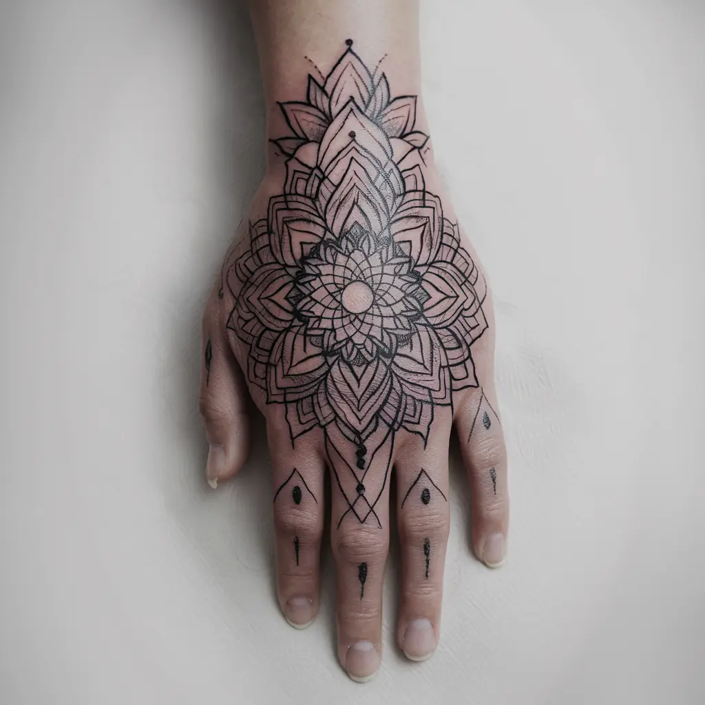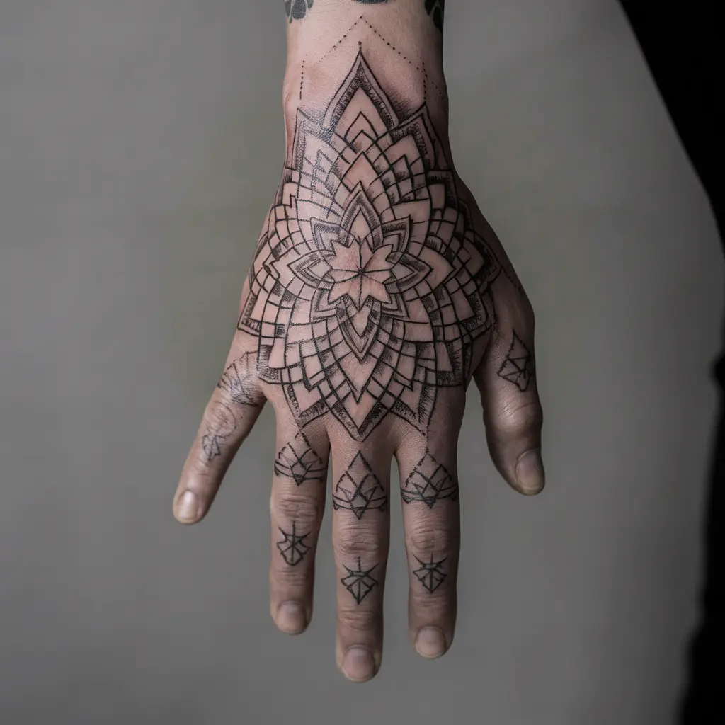 I’m sure you’ve seen mandala tattoos, with their complex and symmetrical patterns that symbolize balance and unity. A full hand tattoo featuring a geometric mandala can extend from the back of your hand, wrapping all the way to the wrist. The repetition and symmetry of the design make it visually stunning and deeply meaningful.