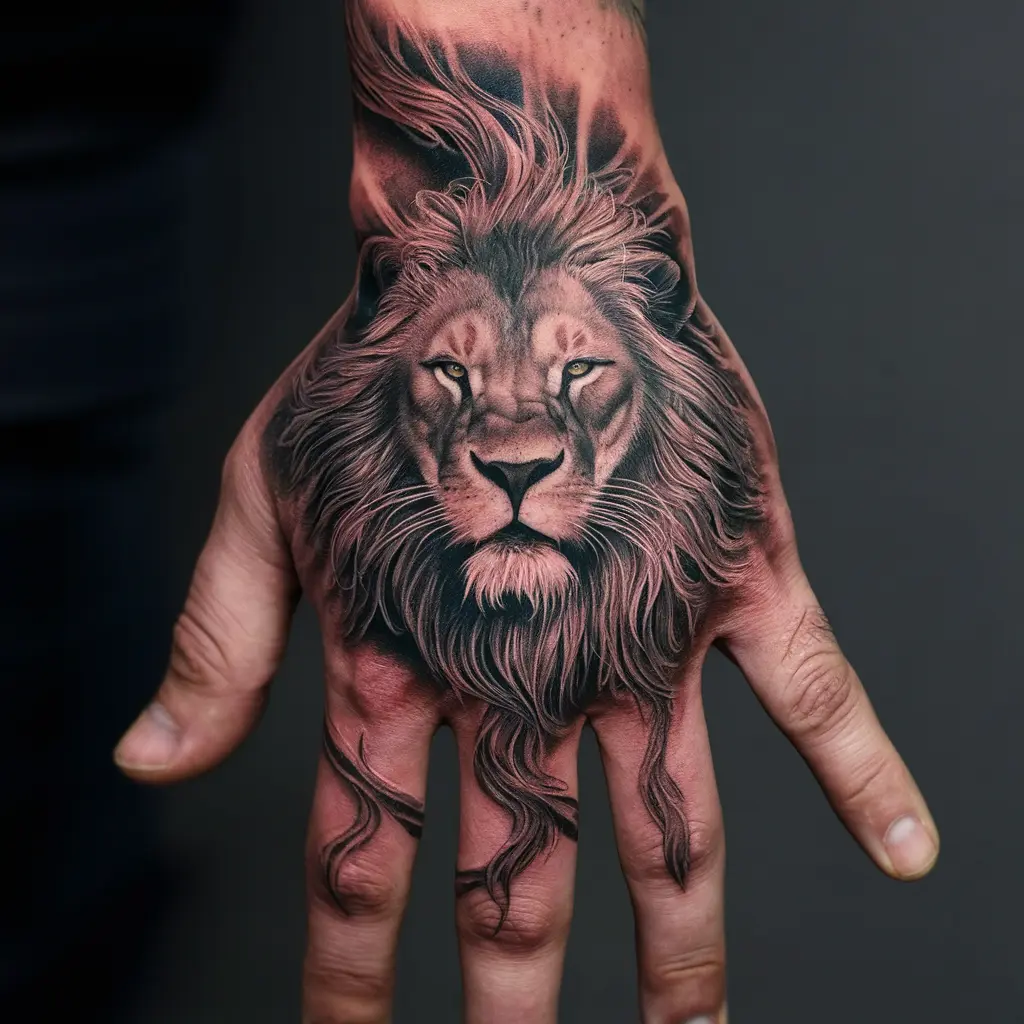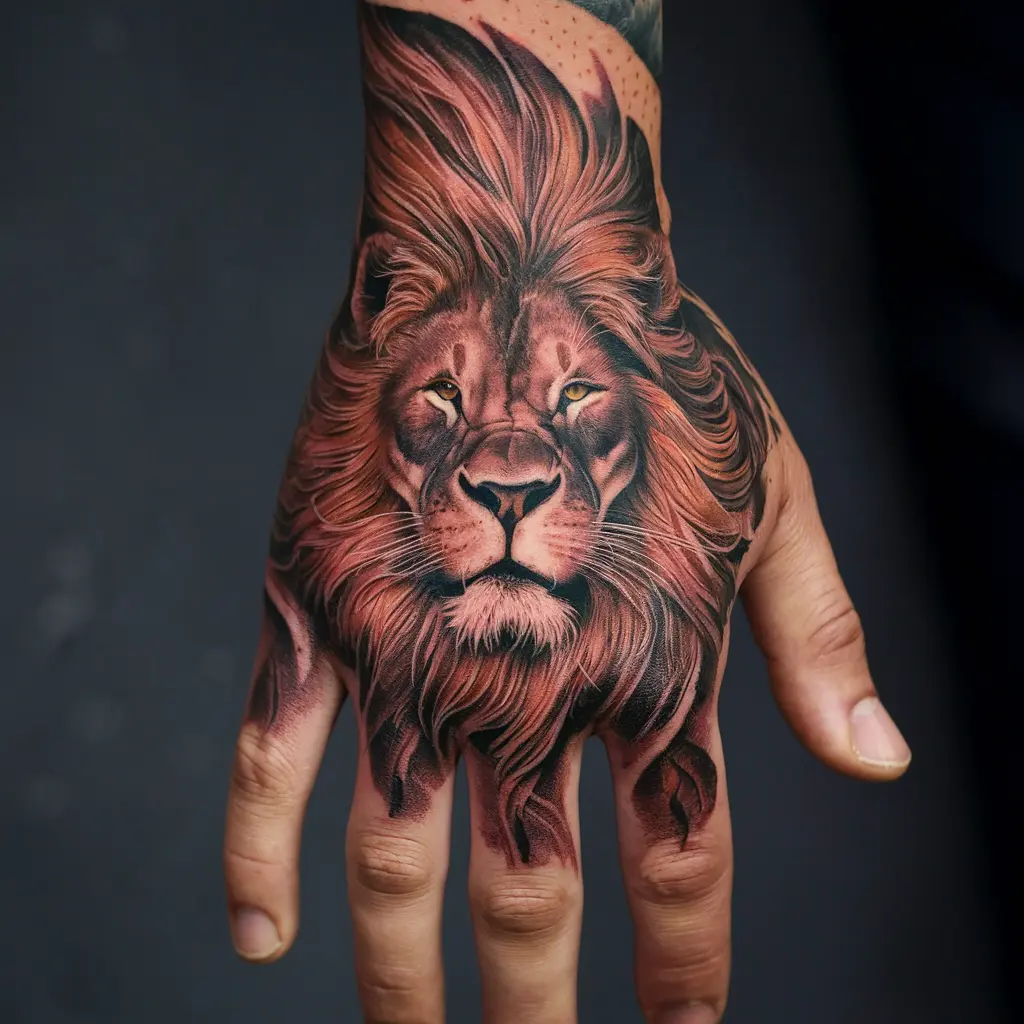 Placement: The lion’s head sits at the back of the hand, with its mane extending down to the wrist and fingers.