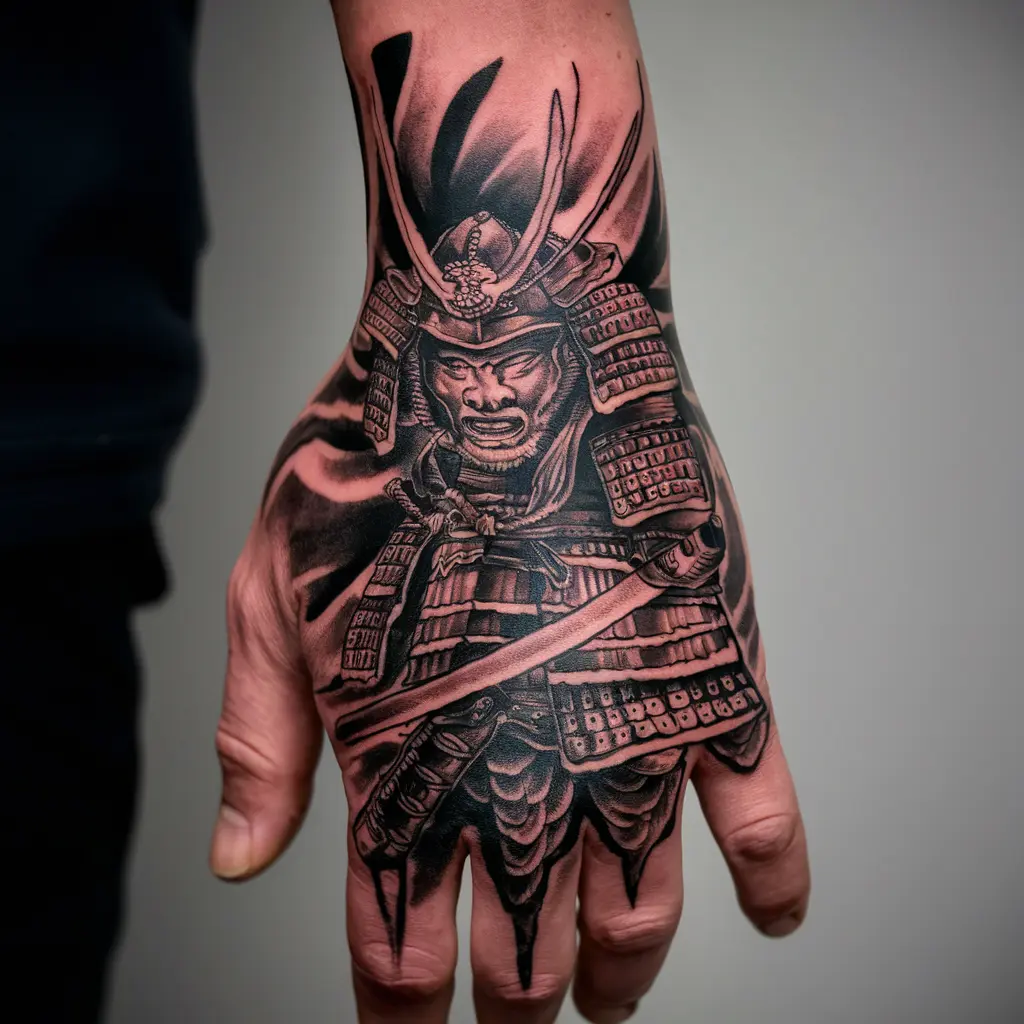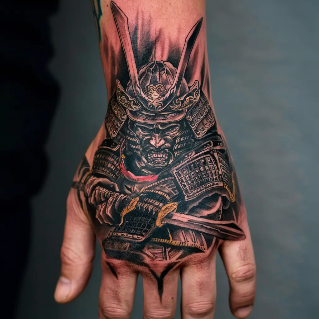 Samurai tattoos have deep cultural significance, symbolizing strength, discipline, and honor. A full hand tattoo of a samurai warrior with intricate details can span the back of the hand and wrist, giving a detailed and dramatic look.