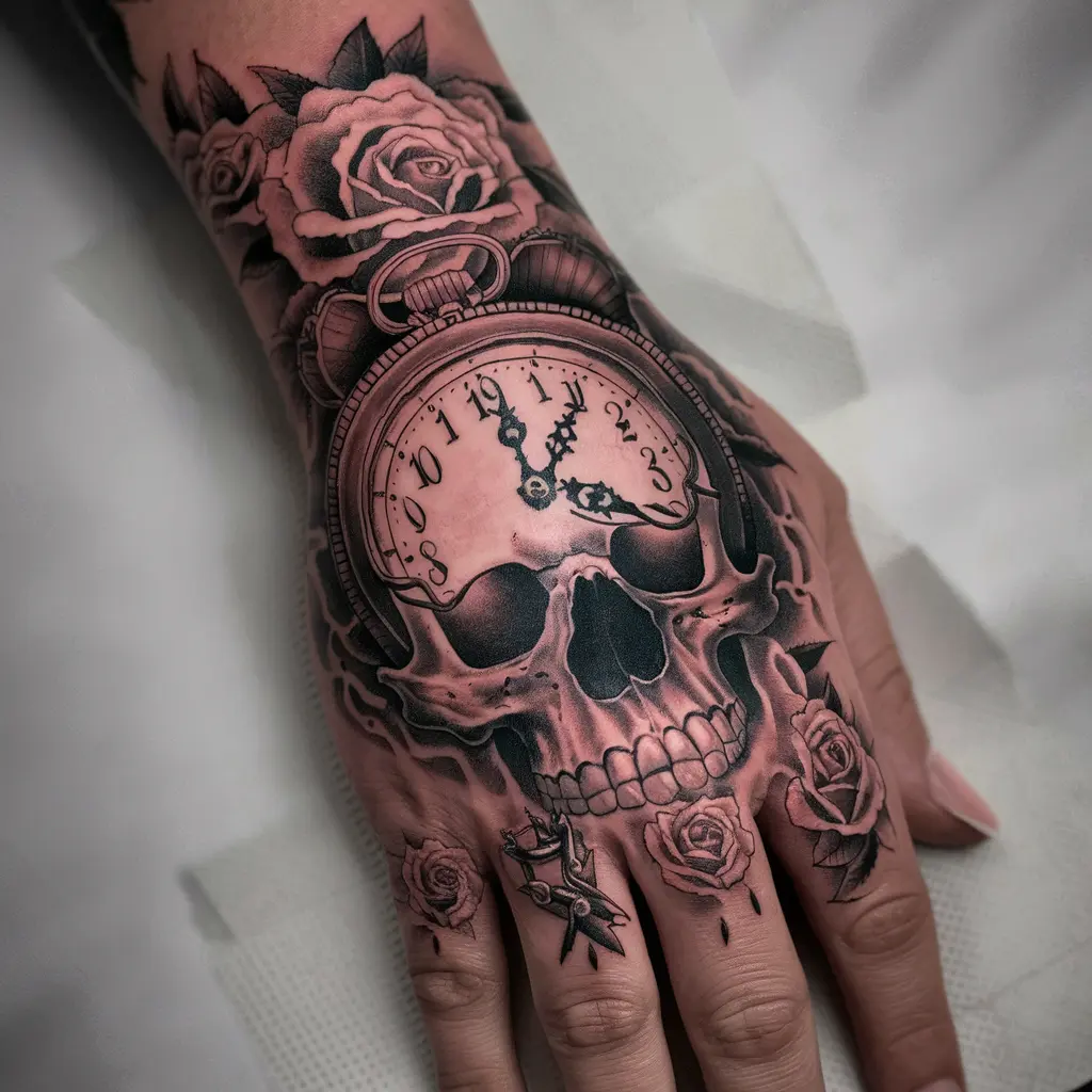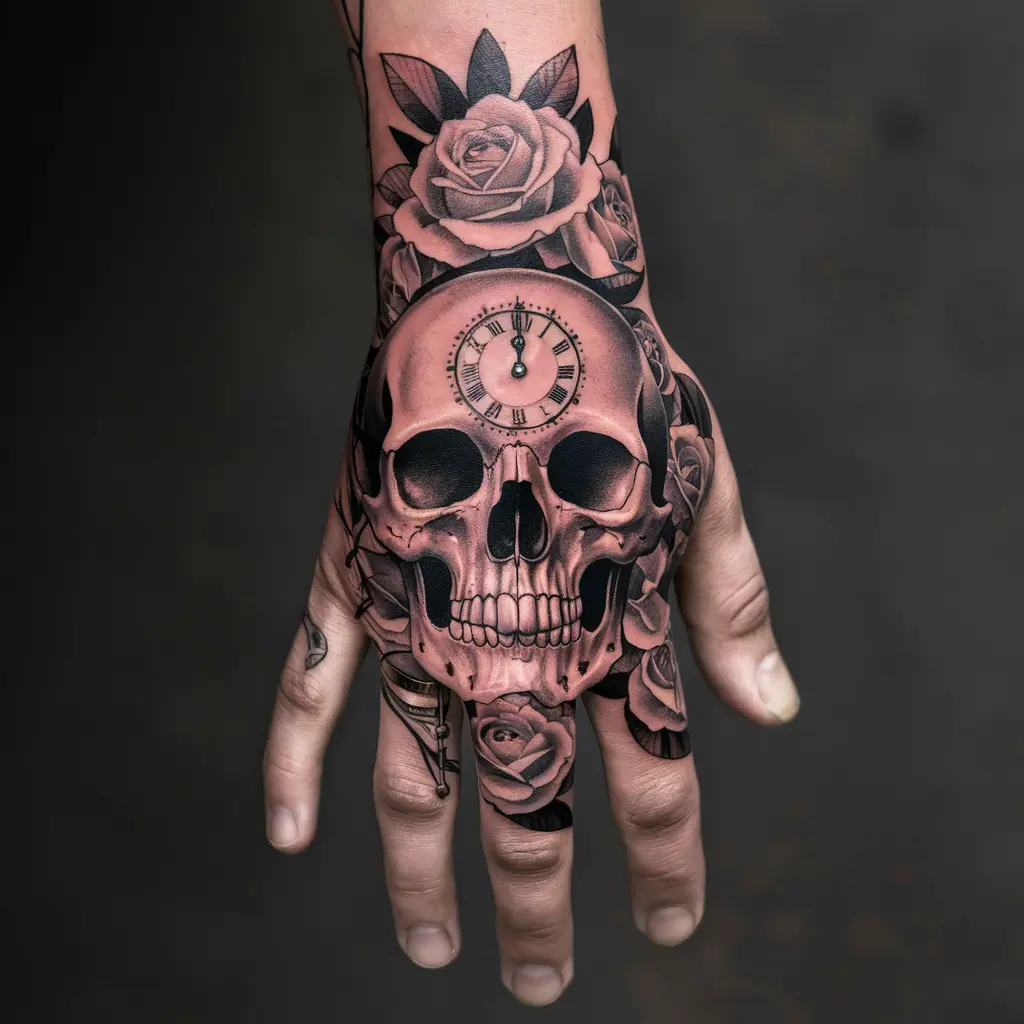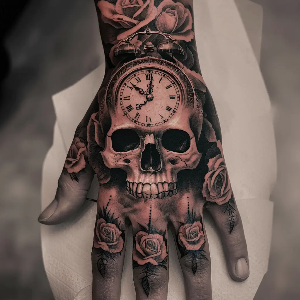 A skull paired with a vintage clock is a perfect combination for those who want a tattoo that represents the fleeting nature of time. The skull sits on the back of the hand, with the clock’s hands and numbers extending down to the wrist.
