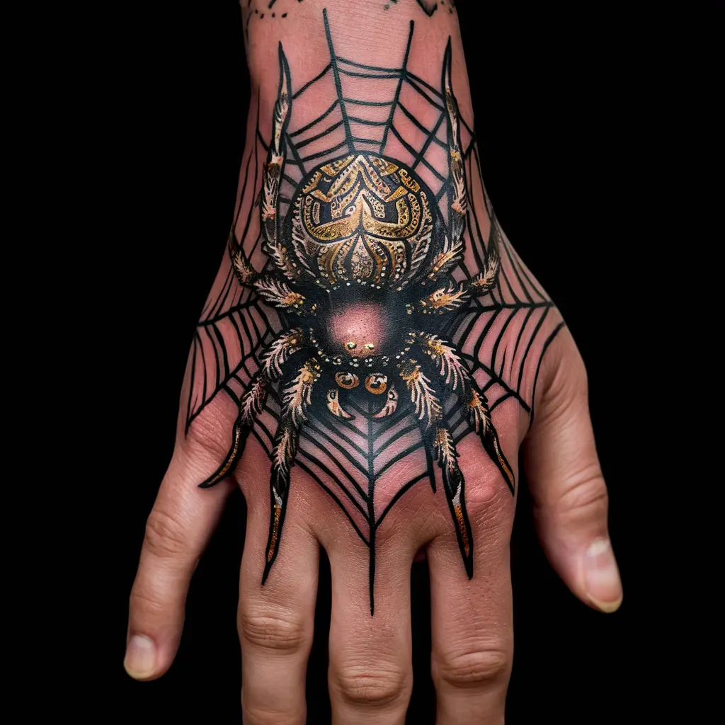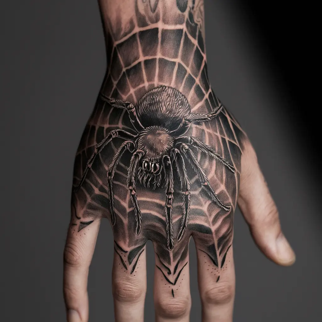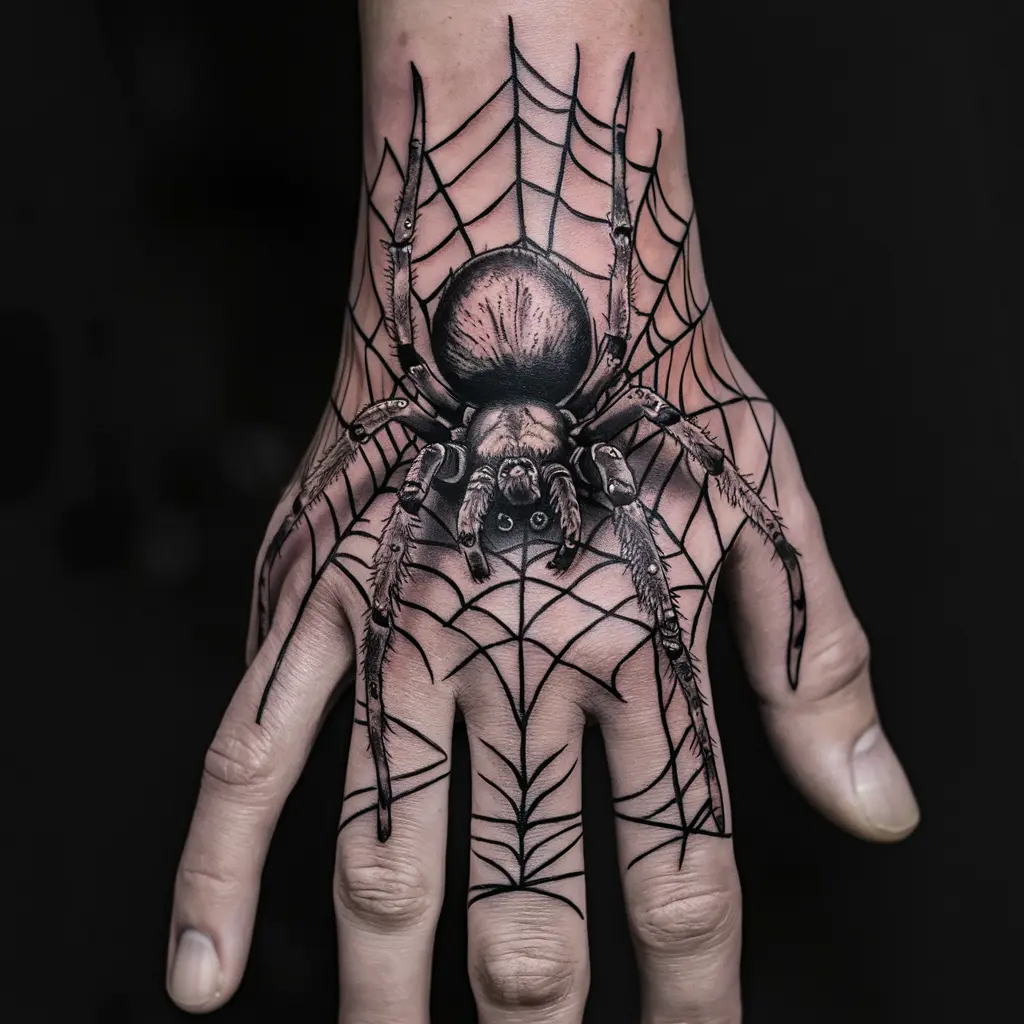 Placement: The web extends from the knuckles, with the spider on the back of the hand.