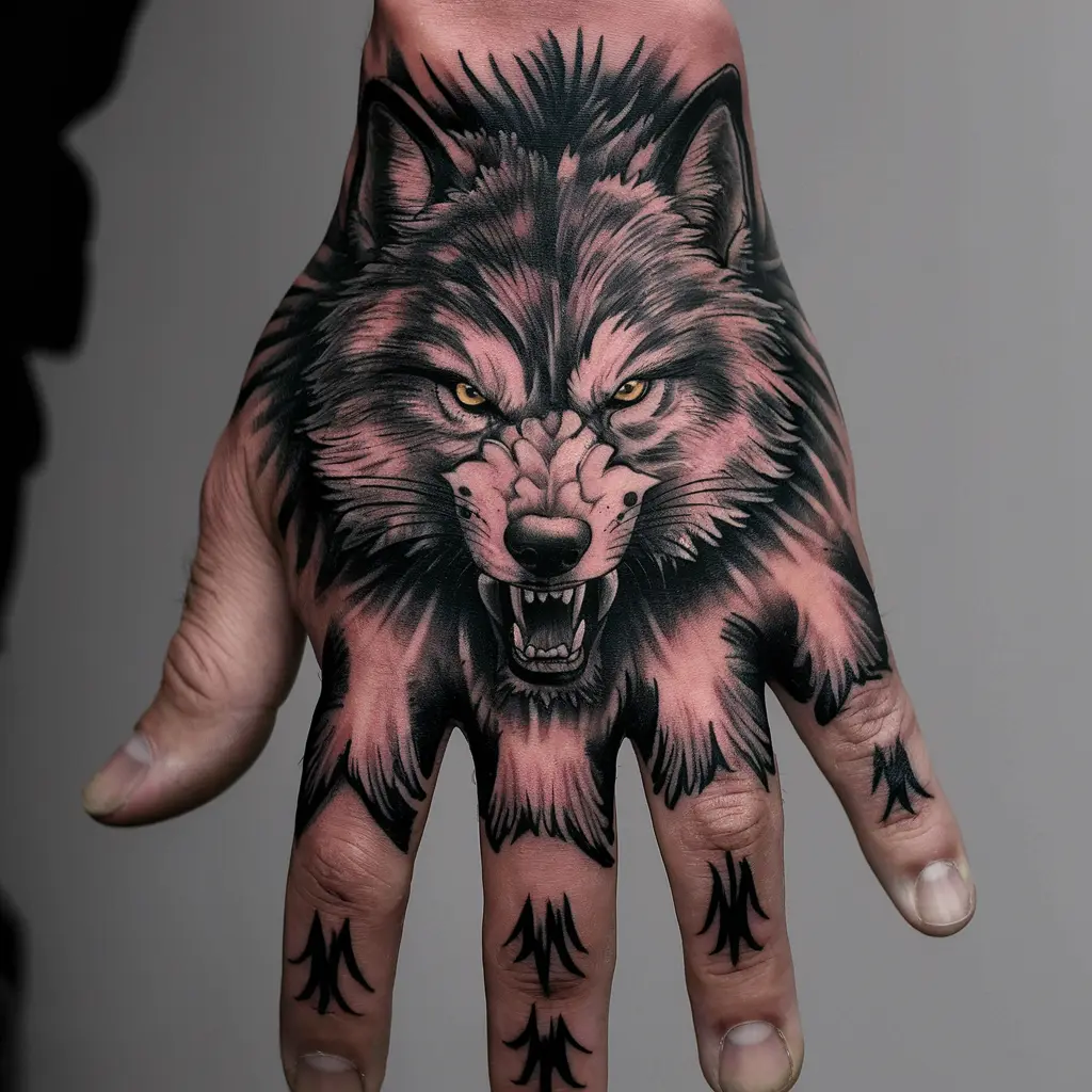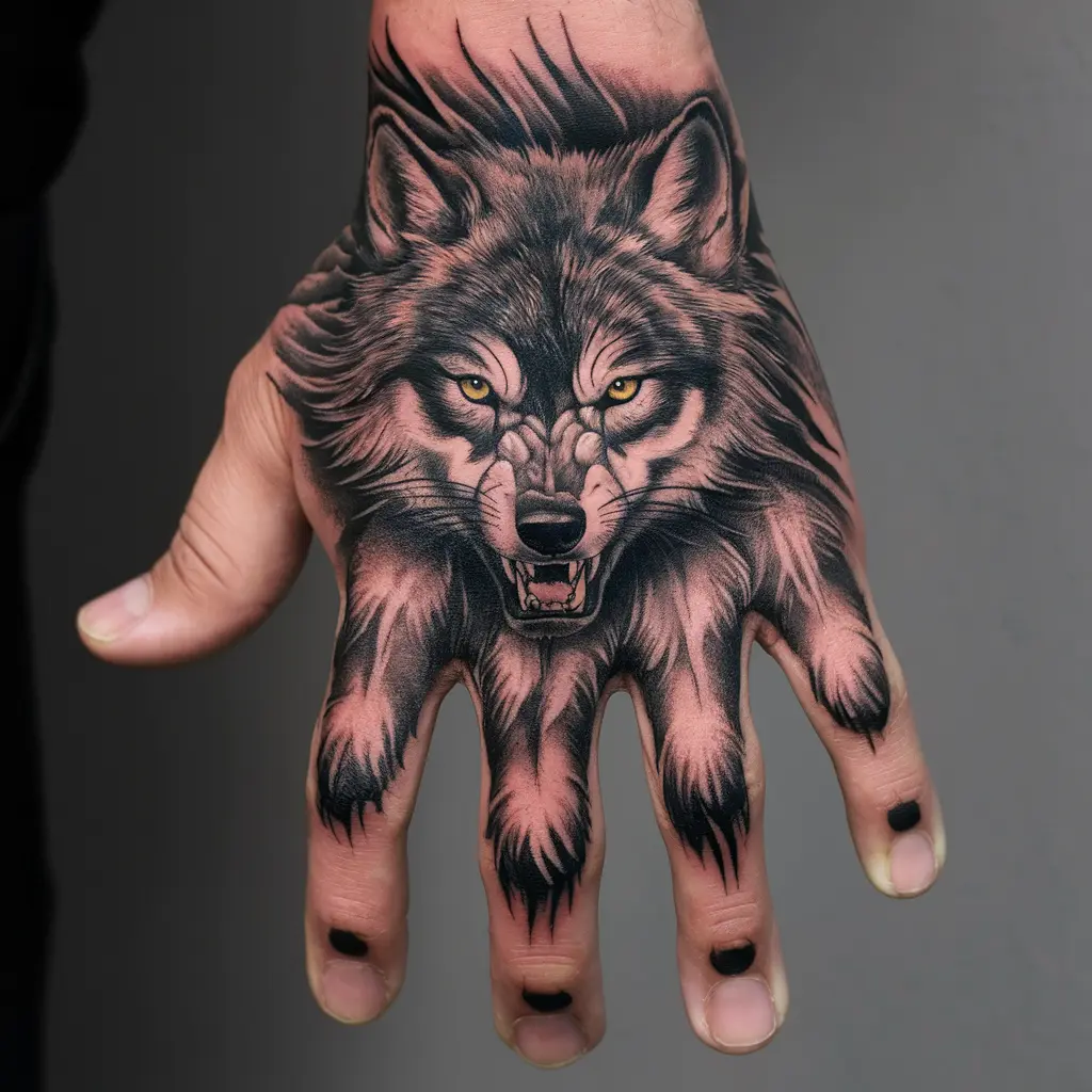 The wolf is a powerful animal symbol, representing loyalty, strength, and protection. A wolf’s head on the back of your hand, with paws extending toward the fingers, gives the tattoo a dynamic and fierce look.