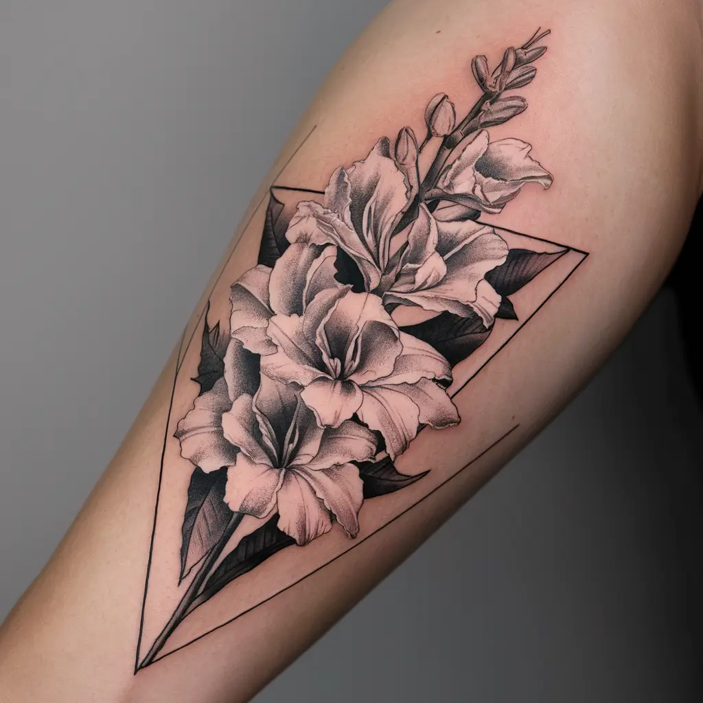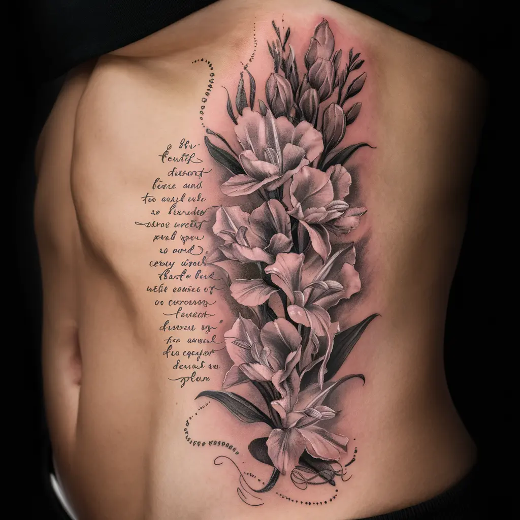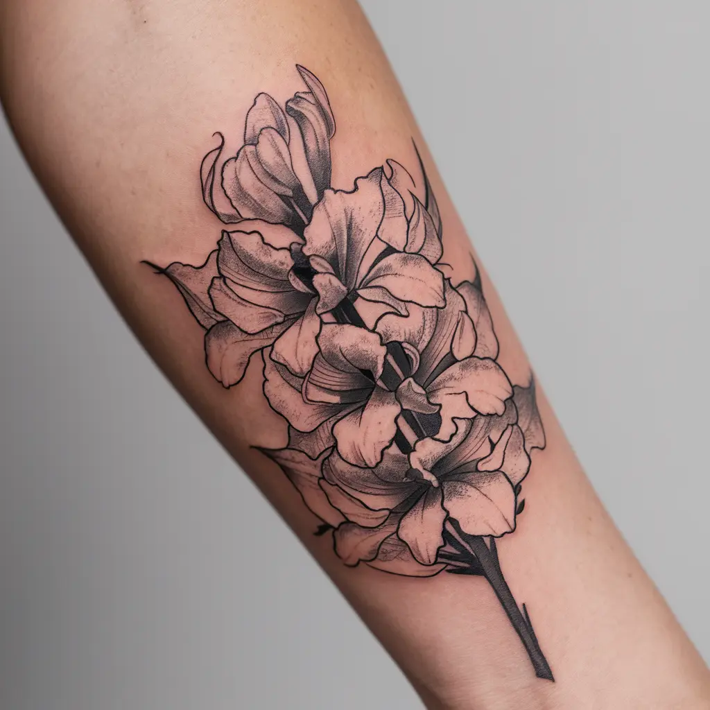 A simple yet striking tattoo that features the slim stem of a gladiolus with a few delicate flowers. This design captures the flower’s elegance in its purest form.