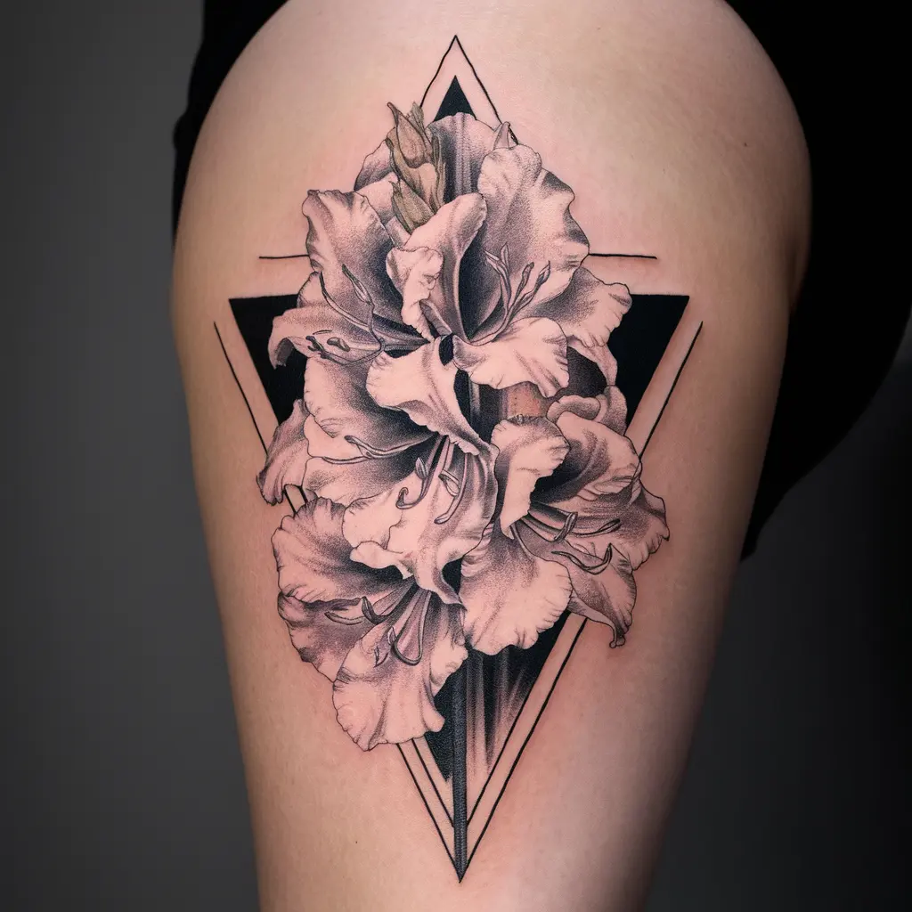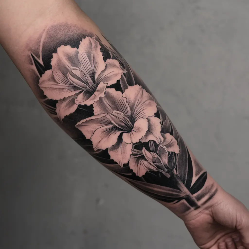 For a more classic look, consider a detailed black and white gladiolus tattoo. The focus is on intricate line work and shading, showcasing the flower’s beauty without color.