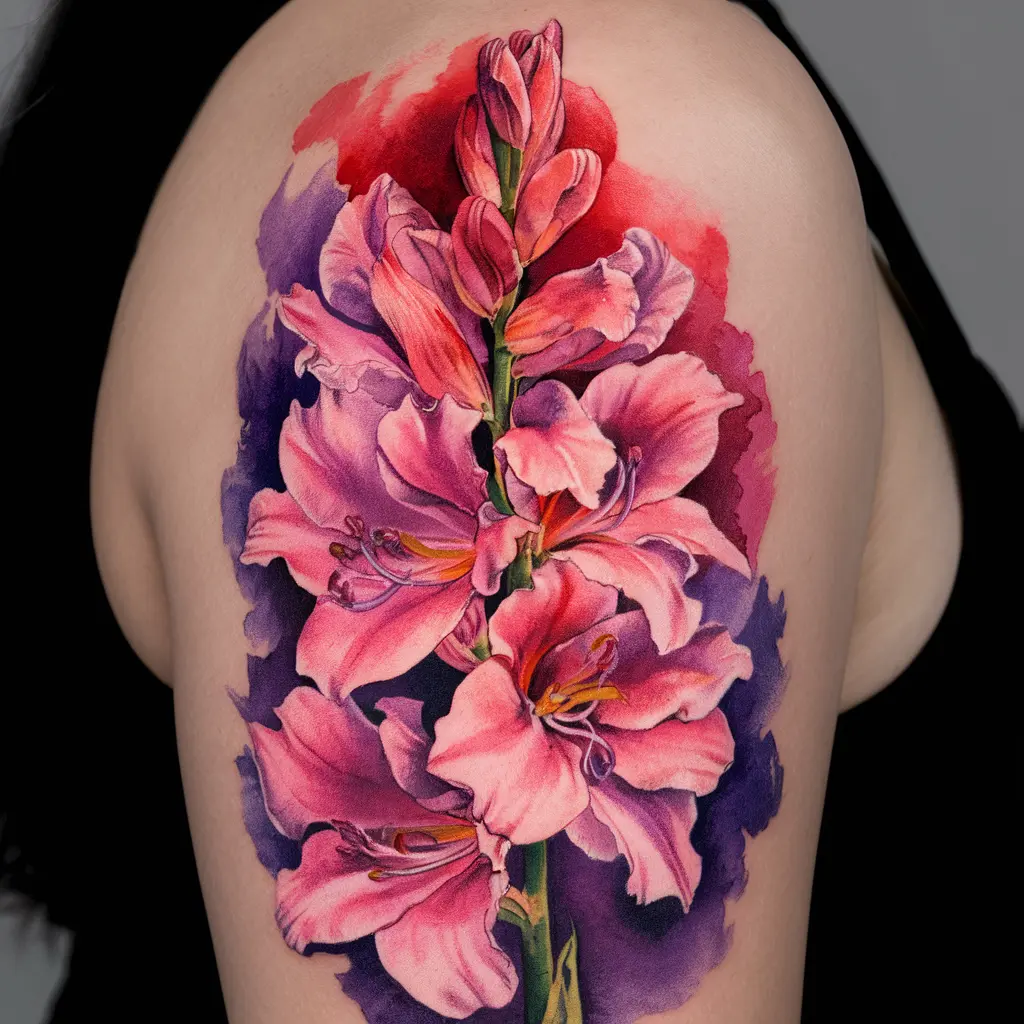 Imagine a gladiolus tattoo brought to life with soft watercolor strokes, blending vibrant pinks, reds, and purples. The flow of the paint gives it an ethereal, dreamy quality.