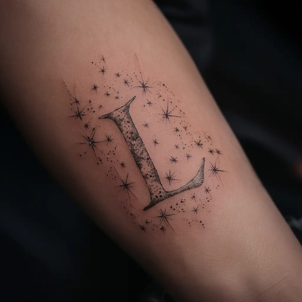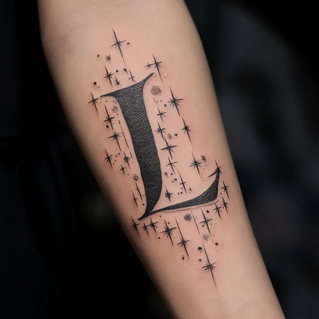 Personalize Description: A simple “L” surrounded by tiny stars, either scattered around the letter or forming a constellation pattern.