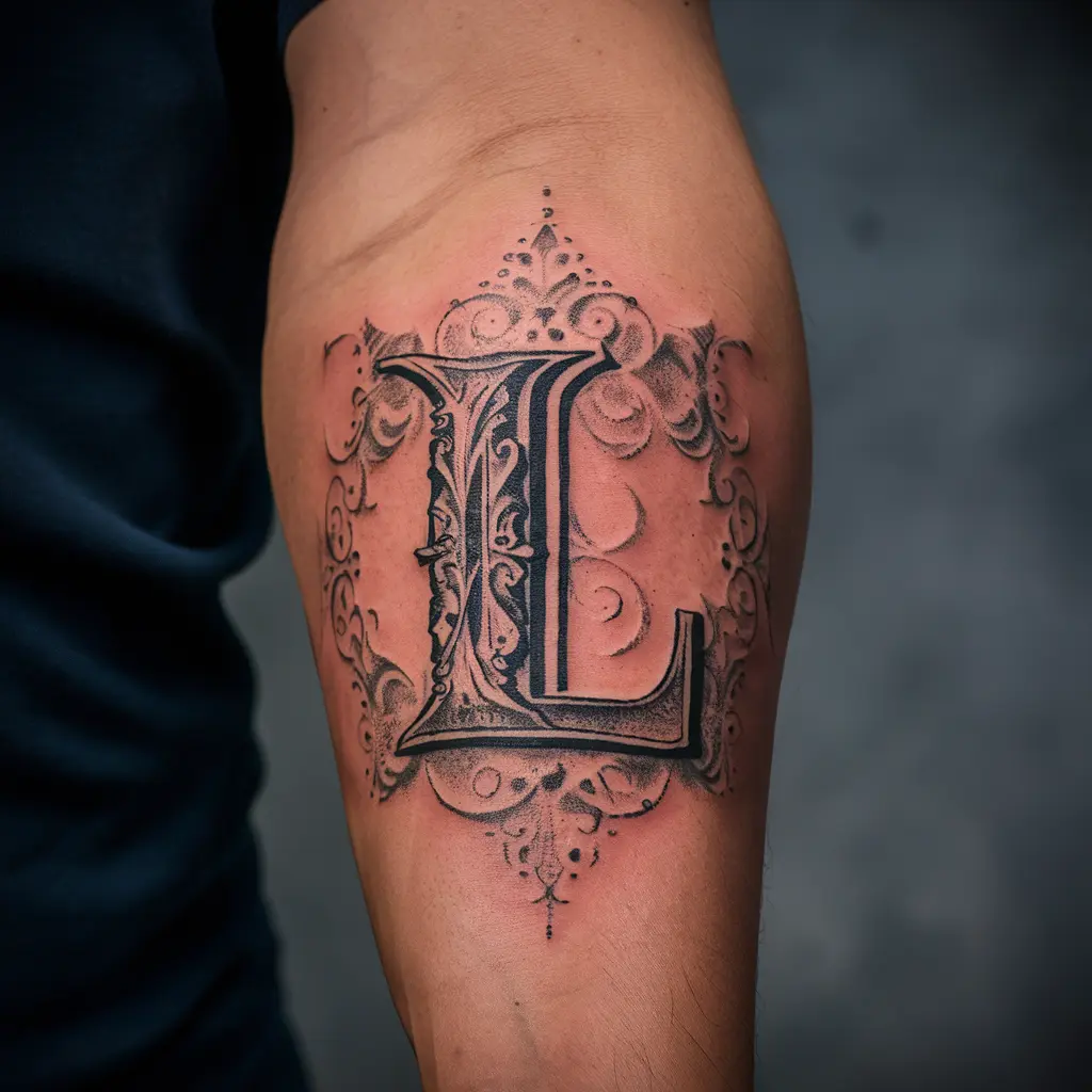 Personalize Description: This tattoo uses a classic, vintage font with decorative flourishes around the letter “L.” It gives off an old-school charm that’s timeless.