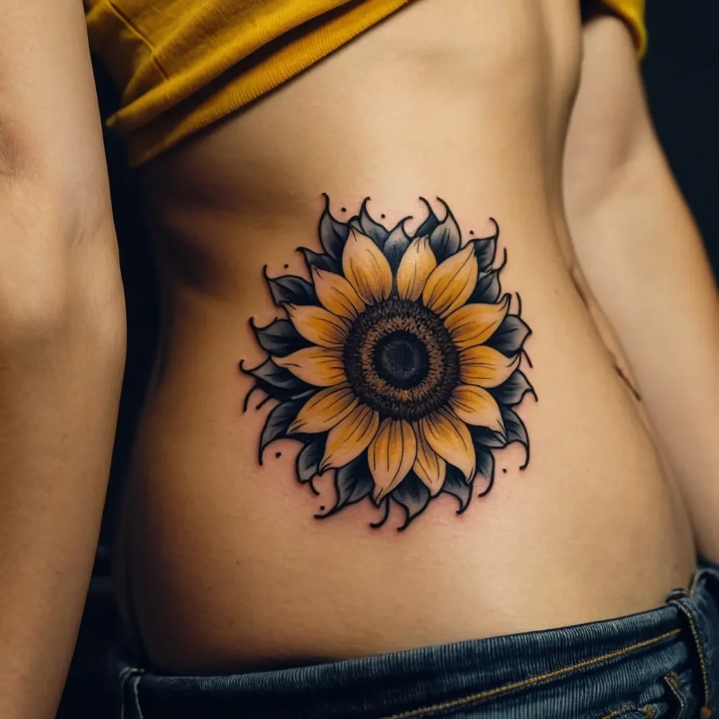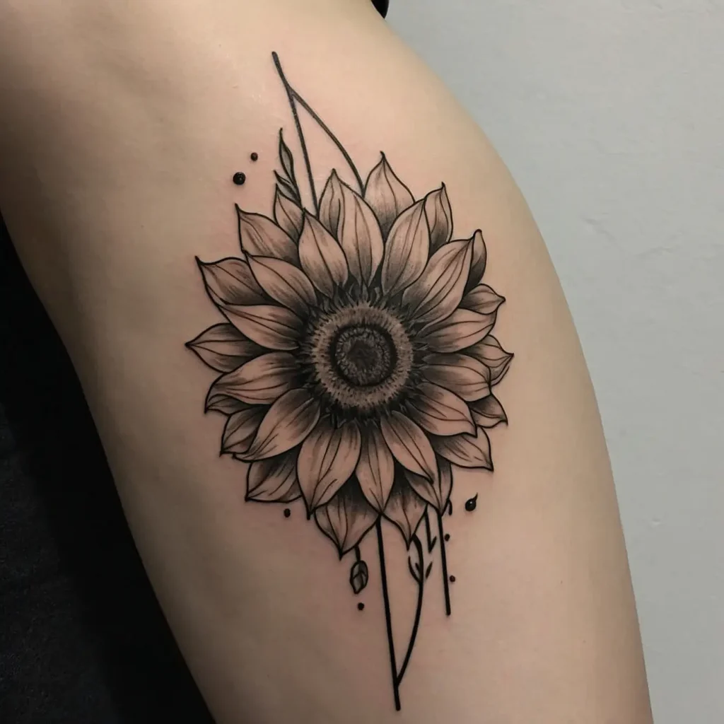 Bright sunflower floral tattoos feature vibrant sunflowers, symbolizing happiness and positivity. They are perfect for individuals who want to express a cheerful and optimistic personality. This tattoo suits those who love nature and seek a bold, lively design. It adds a touch of brightness and warmth, making it a great choice for anyone wanting to celebrate joy and sunshine in their life.