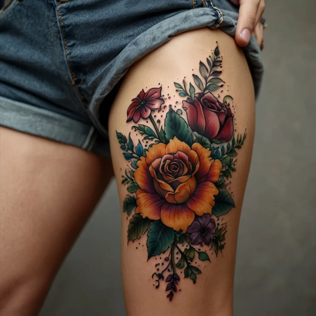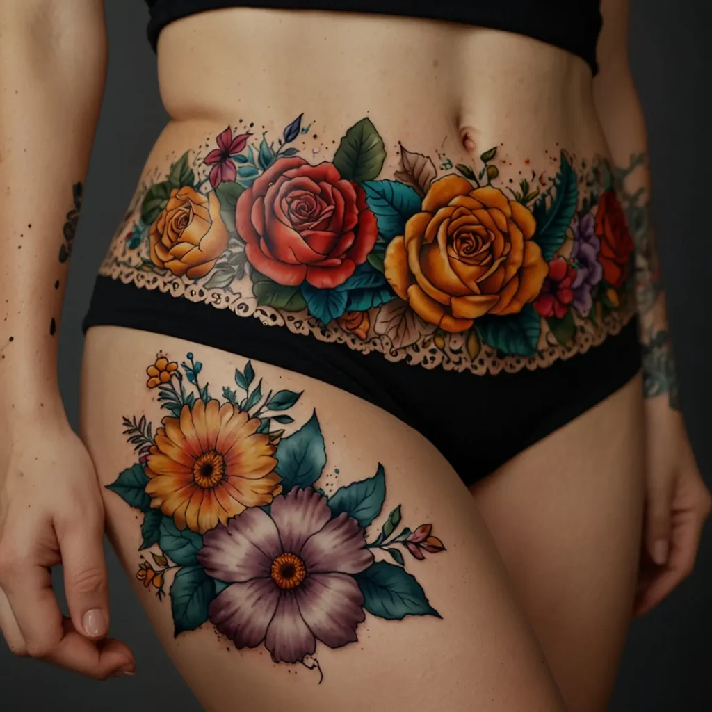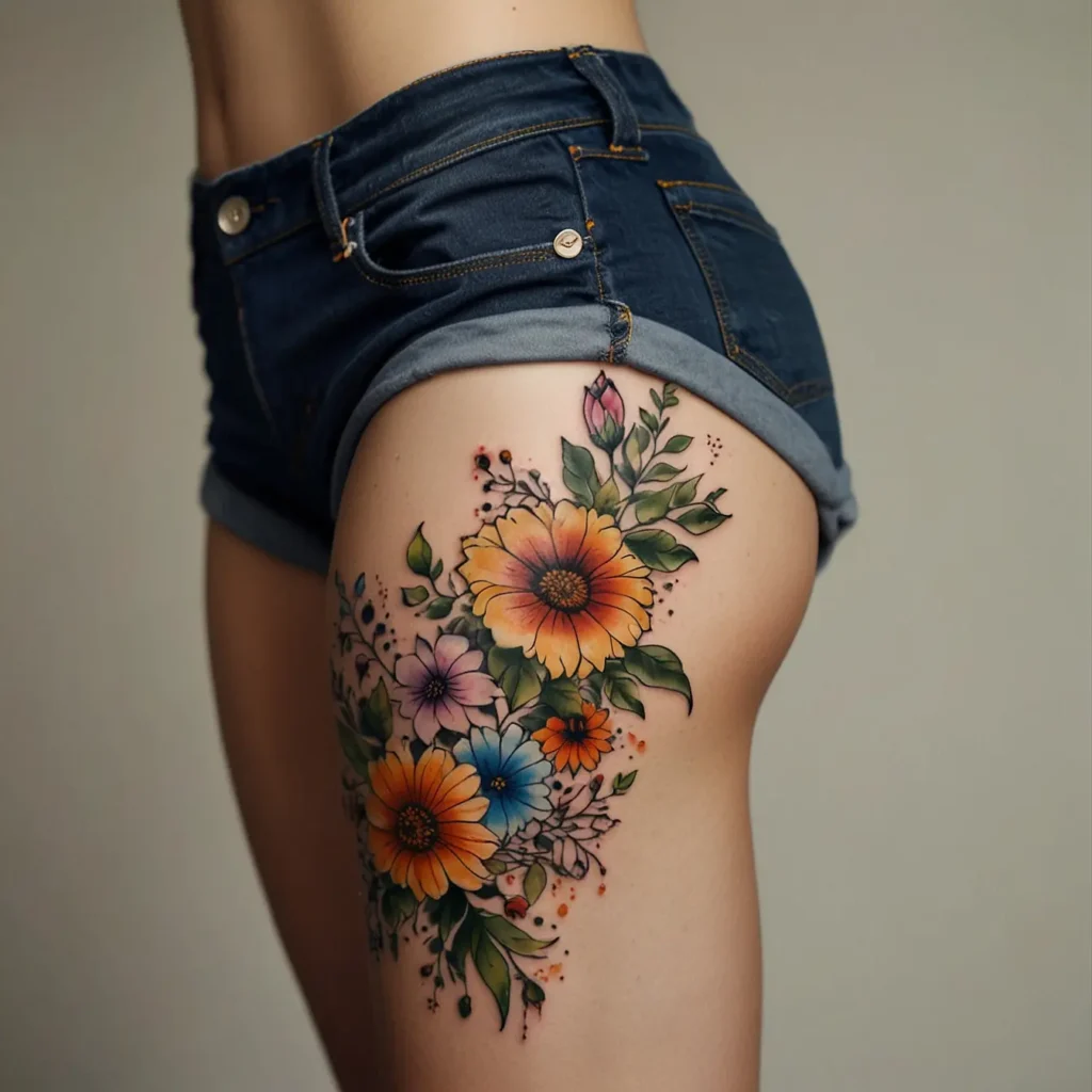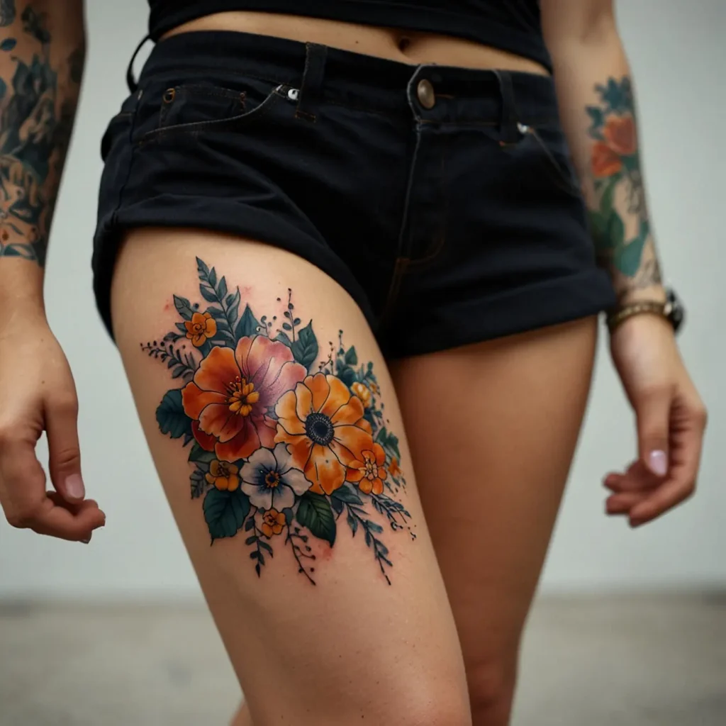 Colorful floral bouquet hip tattoos feature a variety of bright flowers. They represent life, joy, and natural beauty. This tattoo suits those who appreciate bold, eye-catching designs. Perfect for individuals who want to express their love for nature and color. It’s a great choice for anyone wanting a lively and artistic touch on their body, adding a splash of color to their style.