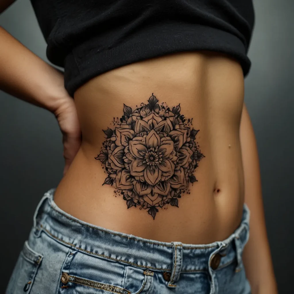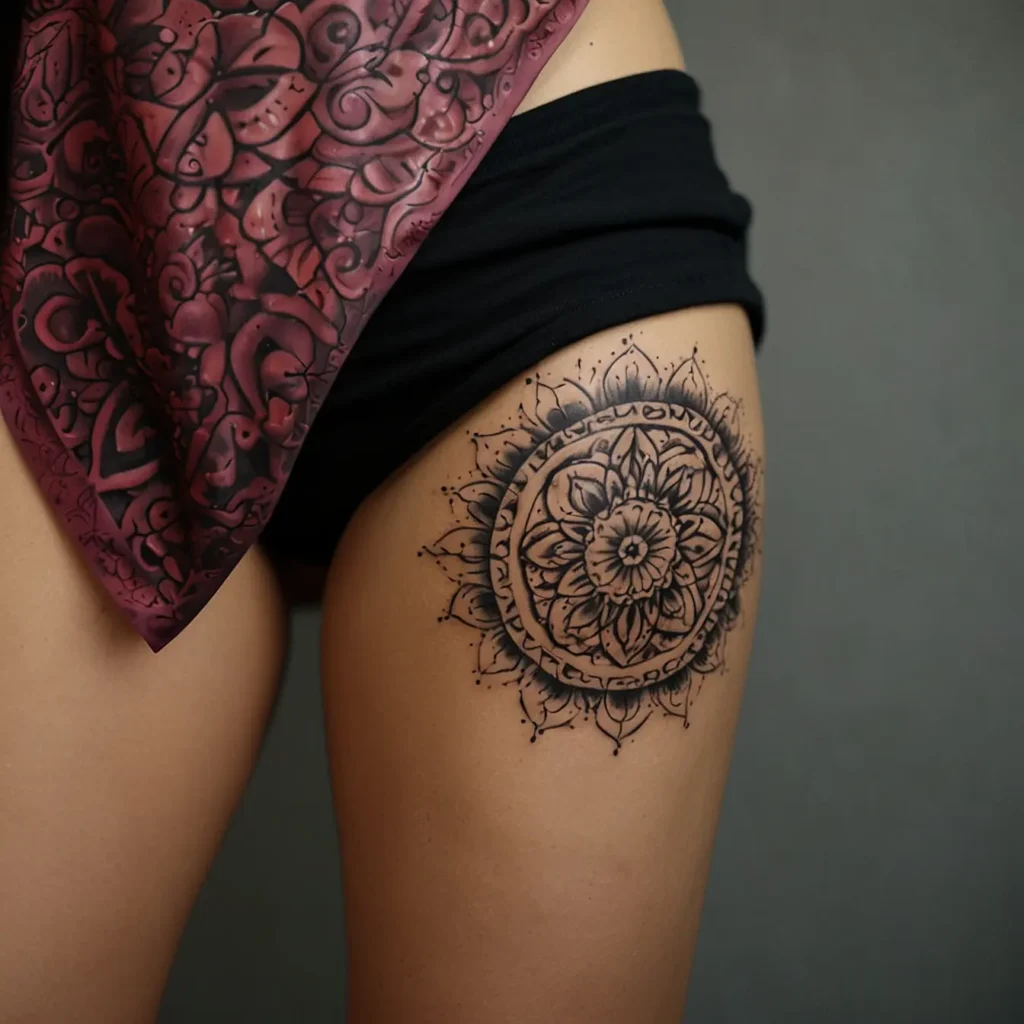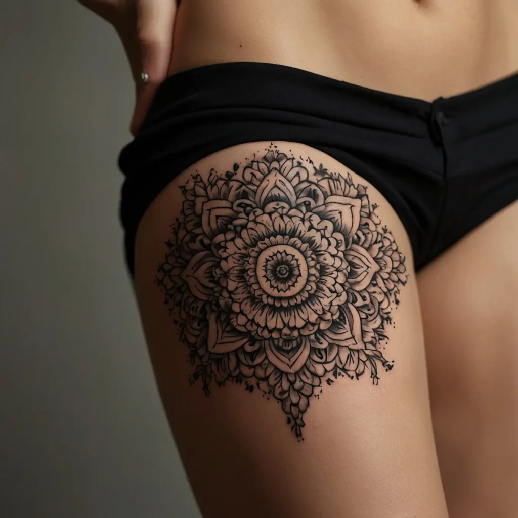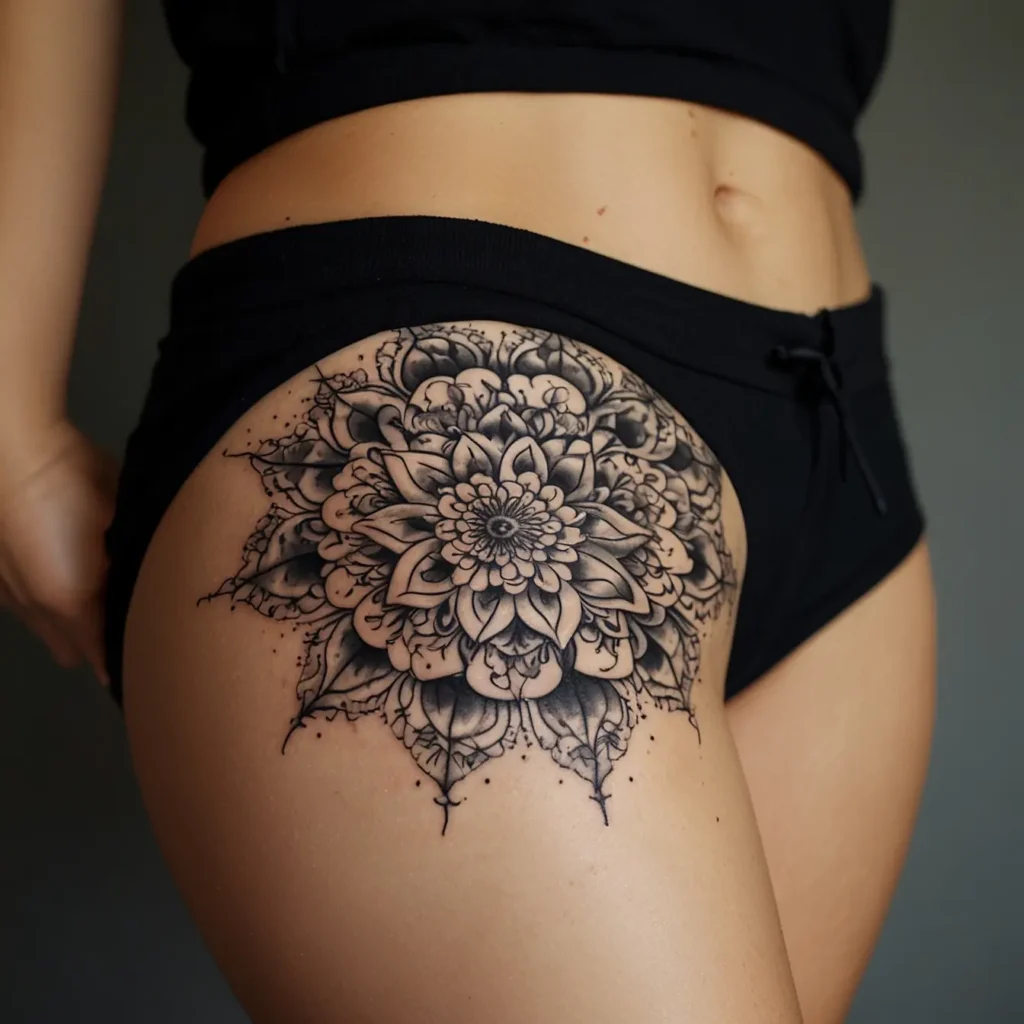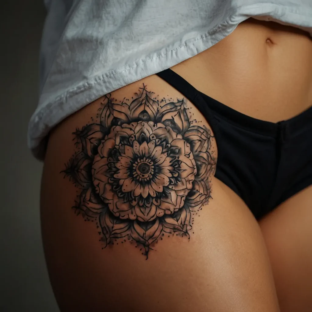 Floral mandala hip tattoos combine intricate floral patterns with mandala designs. They represent harmony, balance, and beauty. Ideal for those who appreciate detailed and artistic tattoos. This design is perfect for people who seek a meaningful and decorative tattoo on their hip. It reflects a love for nature and a desire for tranquility and elegance in body art. Suitable for anyone wanting a striking yet graceful tattoo.