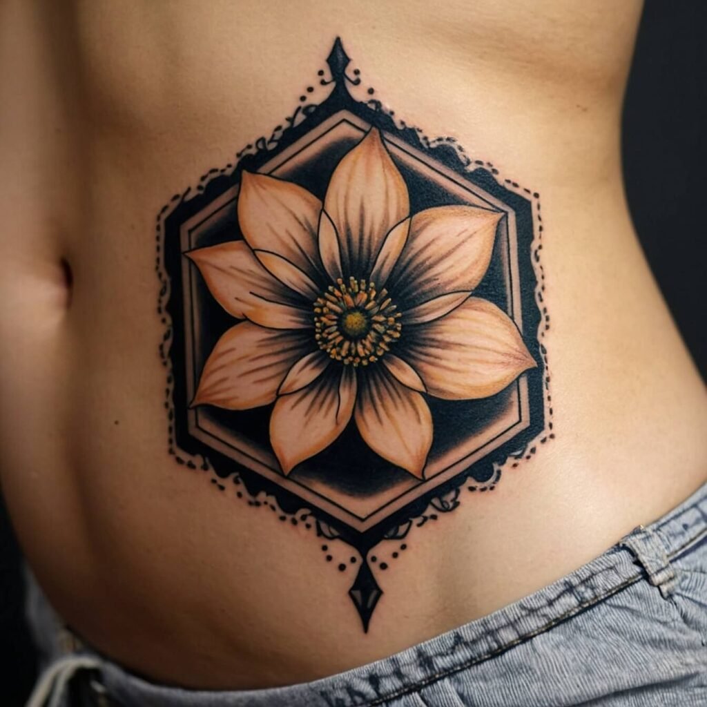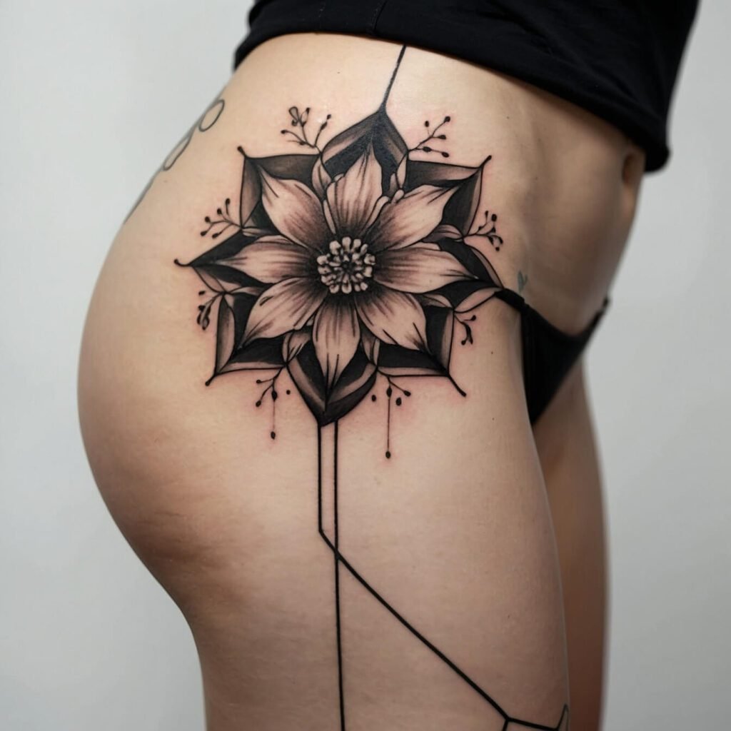 Hexagon flower hip tattoos combine geometric shapes with floral designs. The hexagon symbolizes balance and harmony, while the flowers add beauty and grace. This tattoo is great for people who appreciate both nature and structure. Ideal for those who want a unique and meaningful design, it provides a stylish and sophisticated look that stands out without being overwhelming.