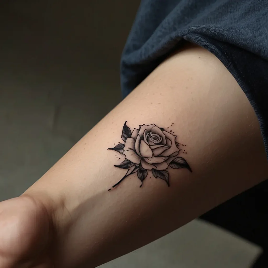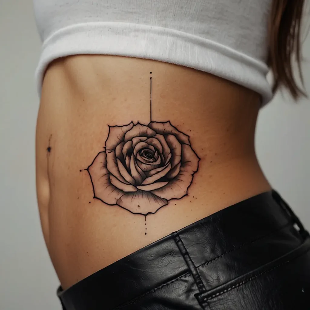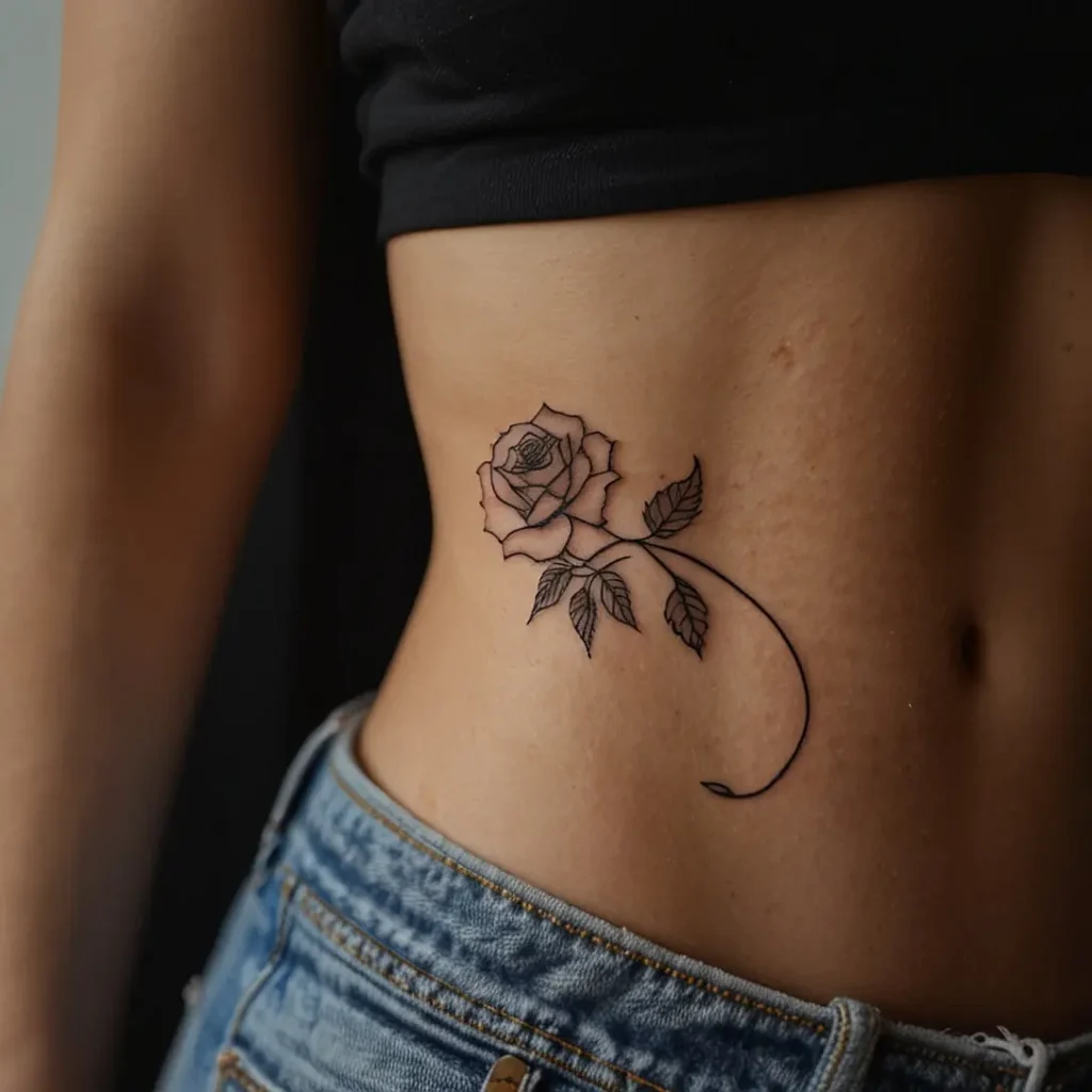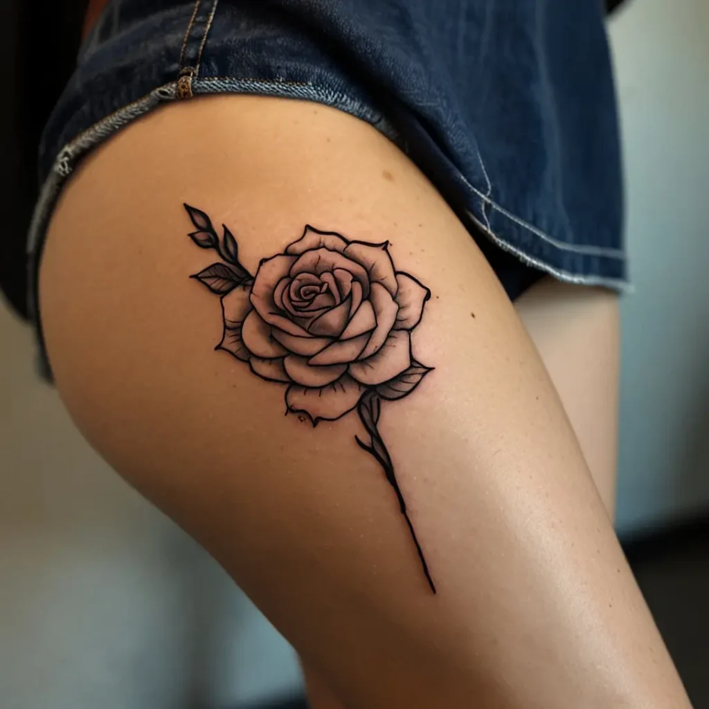 Outline rose floral hip tattoos feature simple, elegant rose designs. They represent love and beauty. This tattoo suits people who appreciate minimalist art and want a classic, feminine look. Ideal for those who want a timeless and graceful design. It adds a delicate touch and makes a subtle statement without being too intricate.