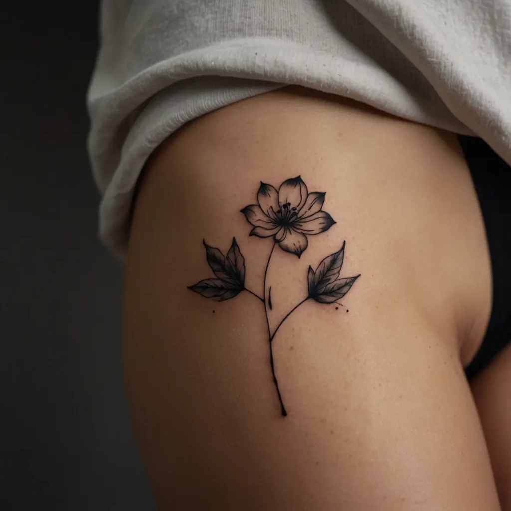 Single line flower hip tattoos are simple yet elegant designs that highlight beauty with minimal detail. Ideal for those who appreciate subtle, artistic body art, these tattoos can symbolize growth, nature, and femininity. Suitable for anyone looking for a delicate, meaningful tattoo, this design adds a touch of grace and personal expression to your style.