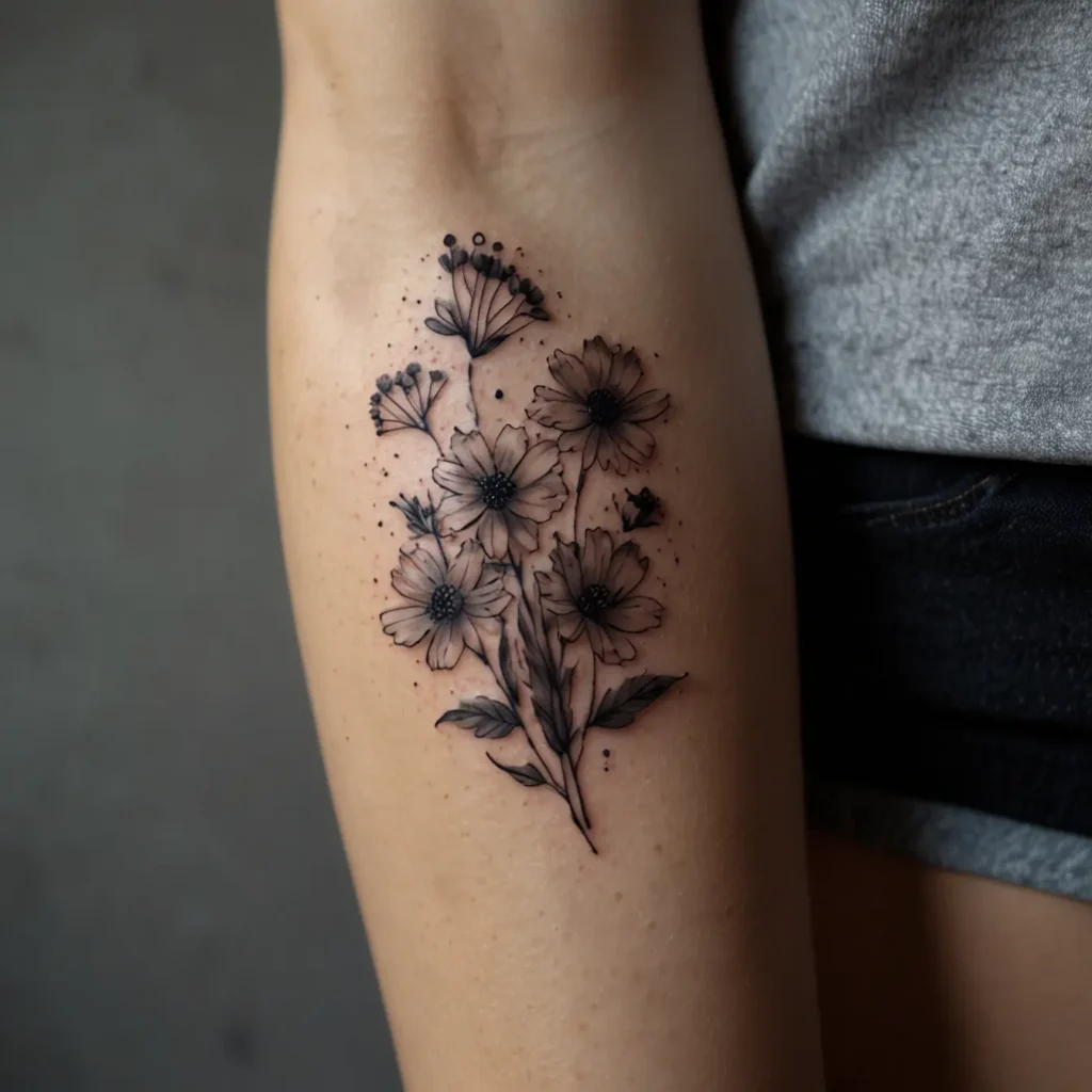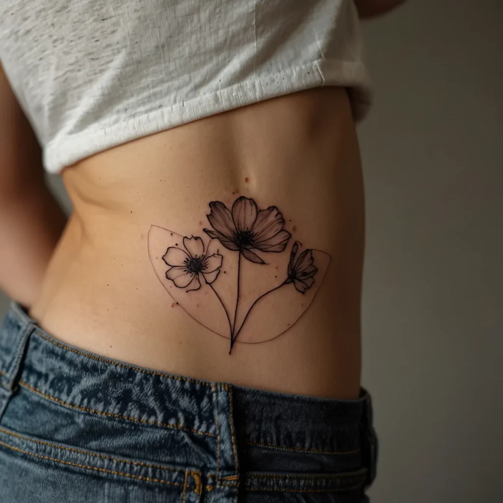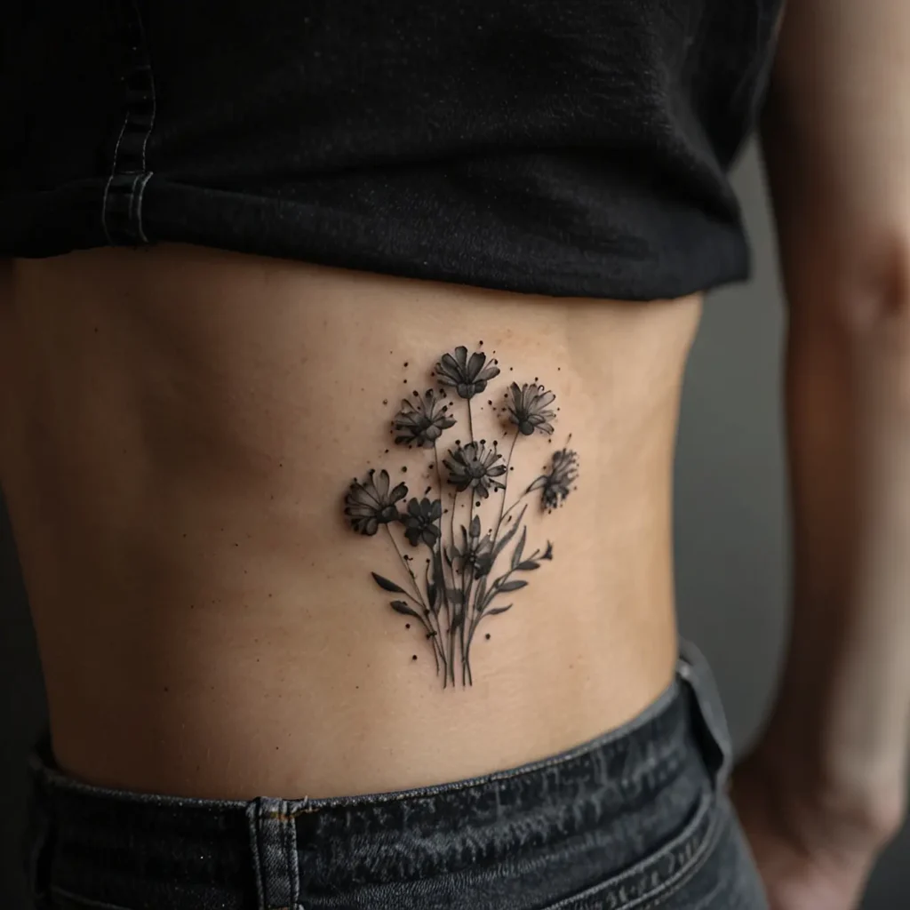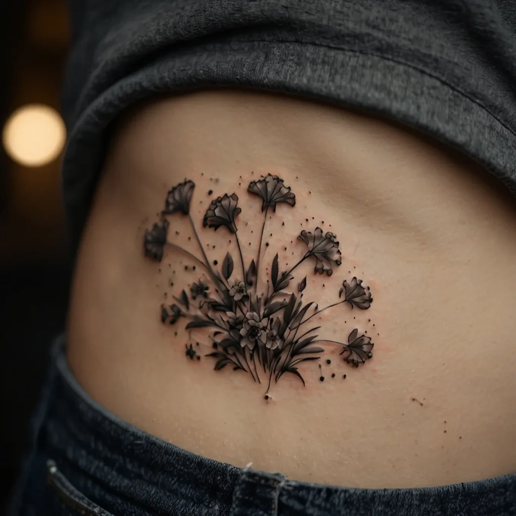 Tiny flower cluster hip tattoos are small, pretty designs of flowers on the hip. They symbolize beauty and delicacy. This tattoo is perfect for those who want a subtle, elegant look. Ideal for people who love nature and want a feminine and understated design. It adds a touch of charm without being too bold.