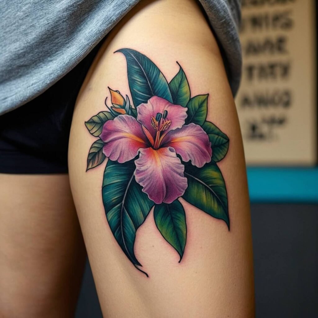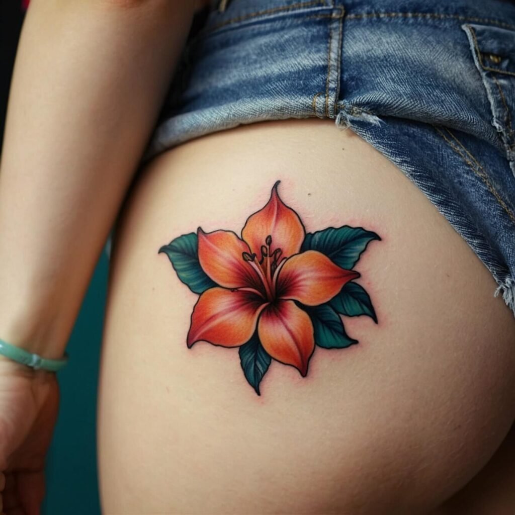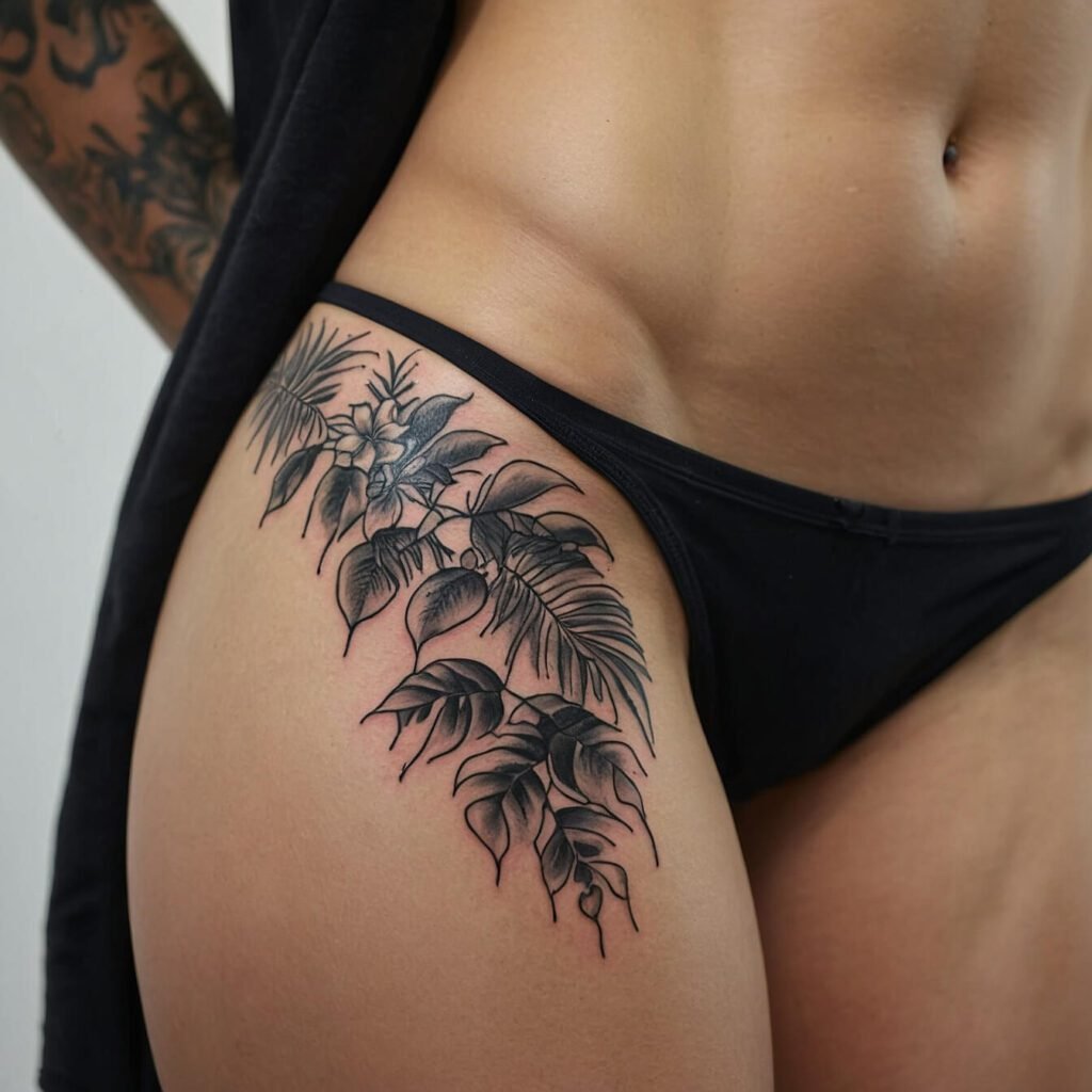 Tropical bloom hip tattoos celebrate nature’s vibrant beauty and free-spirited femininity. These eye-catching designs feature exotic flowers like hibiscus, plumeria, and orchids in a colorful, flowing style. Perfect for beach lovers and adventurous souls, these tattoos add a touch of paradise to your curves. Ideal for women who want to express their inner goddess and embrace their sensual side with a dash of tropical flair.