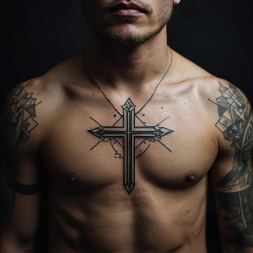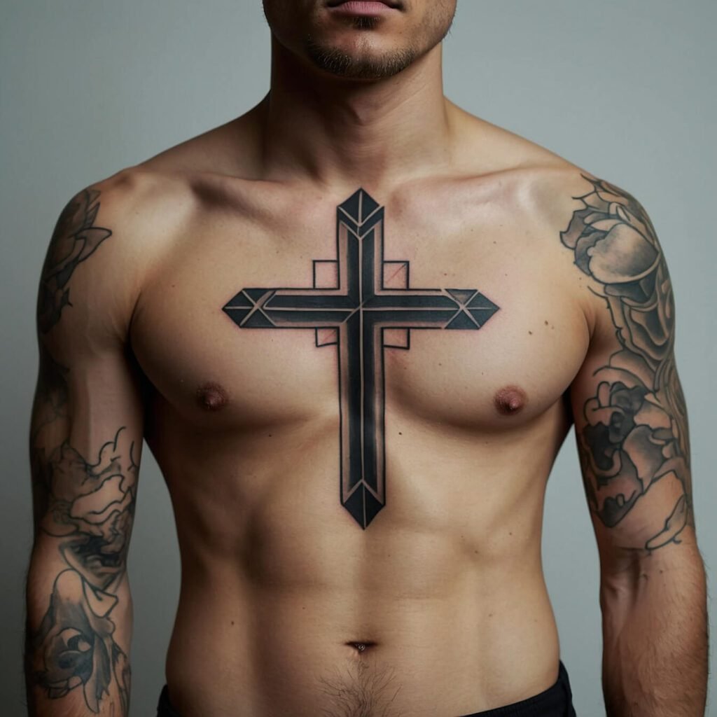 Placed on the chest, it’s both eye-catching and understated, making a powerful statement without overwhelming. If you want a design that’s both modern and meaningful, the geometric cross is a perfect fit.