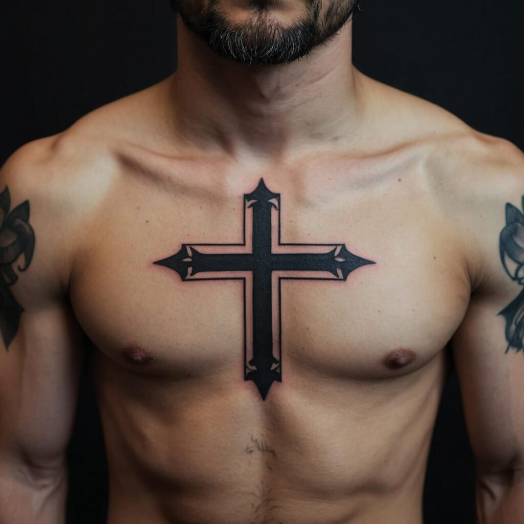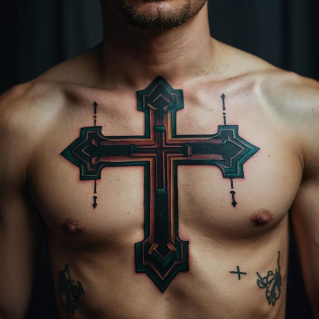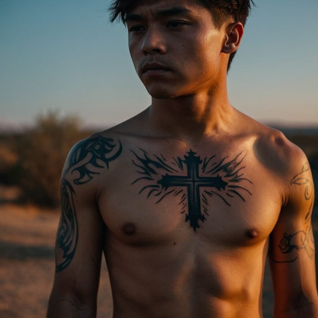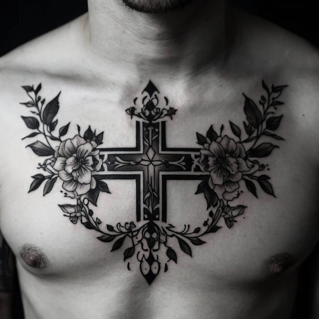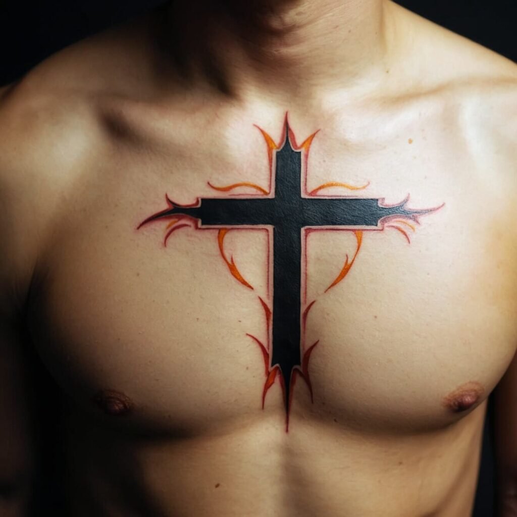 If you’re drawn to bold, edgy designs, a tribal cross is a perfect choice. With its sharp angles and strong lines, this tattoo makes a powerful statement. The tribal cross combines traditional symbolism with a modern, dynamic look. I love how it stands out on the chest, creating a striking visual impact.