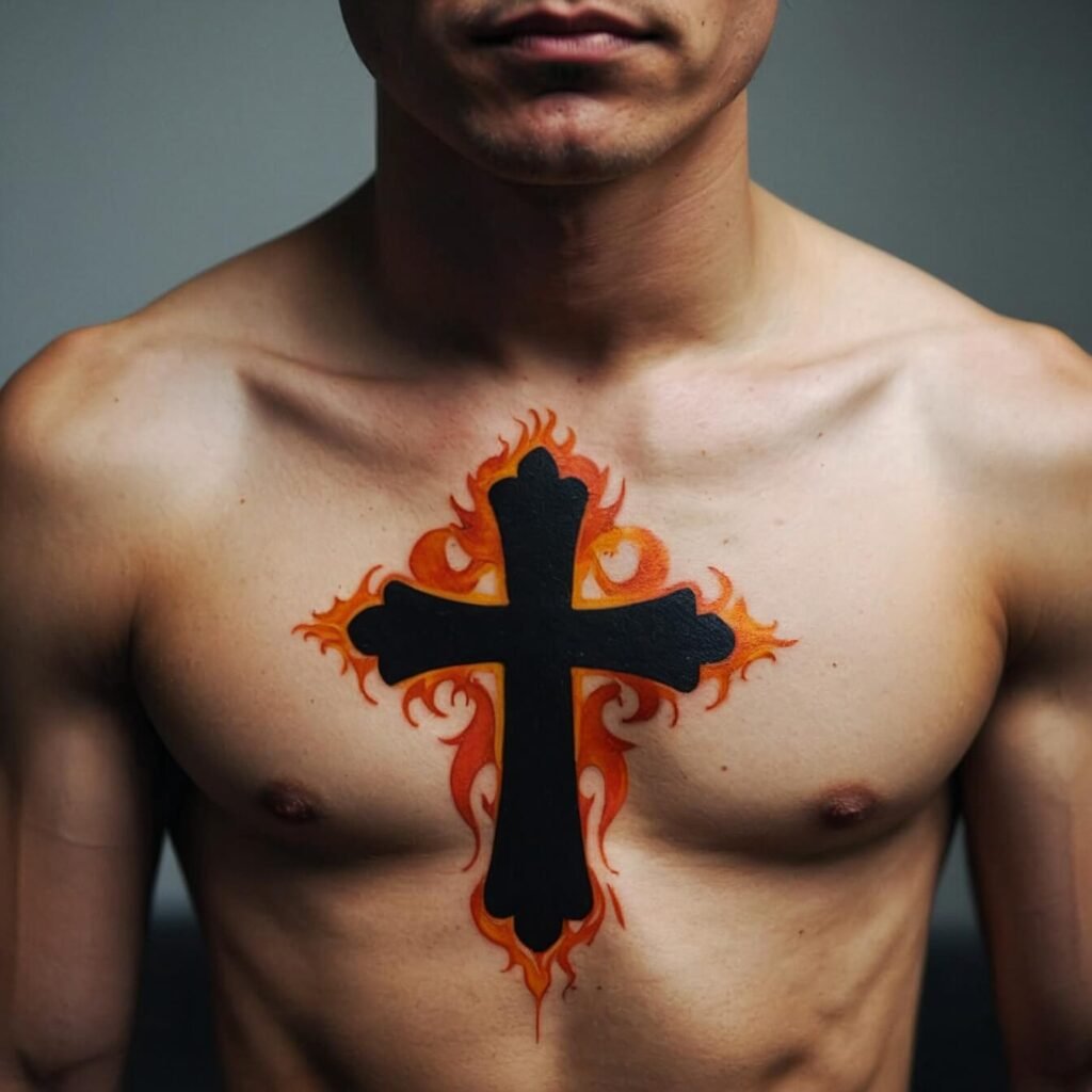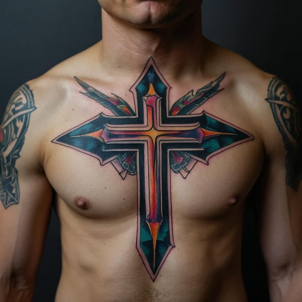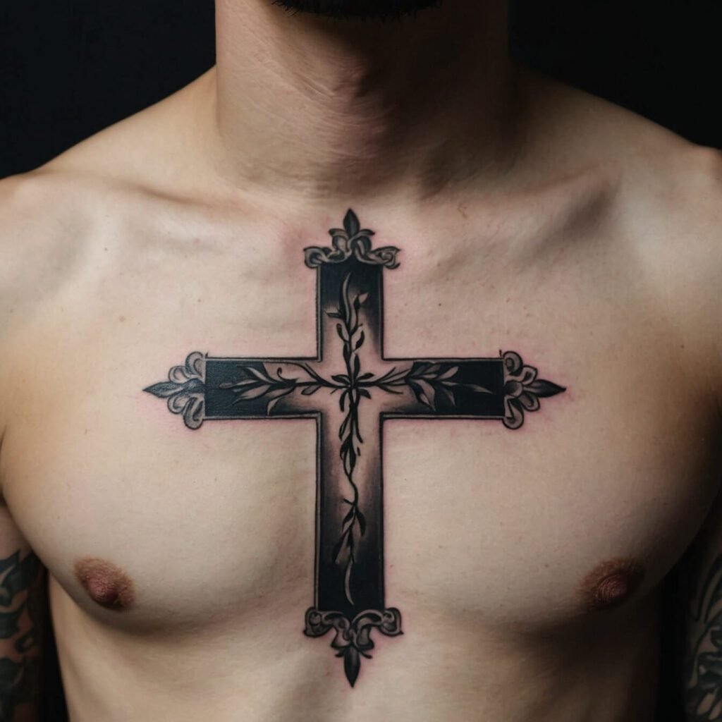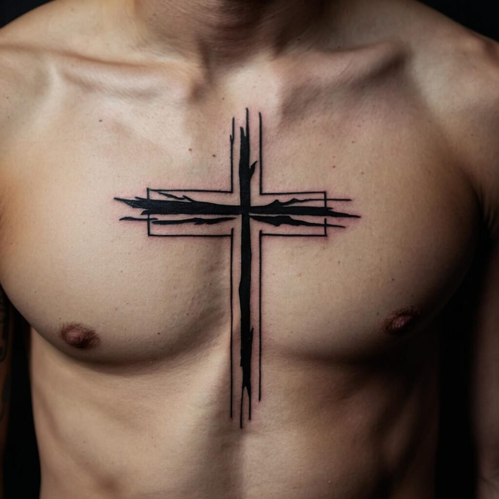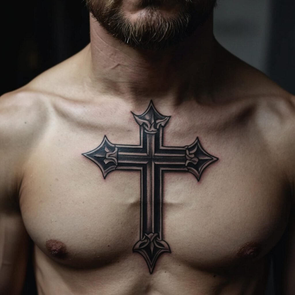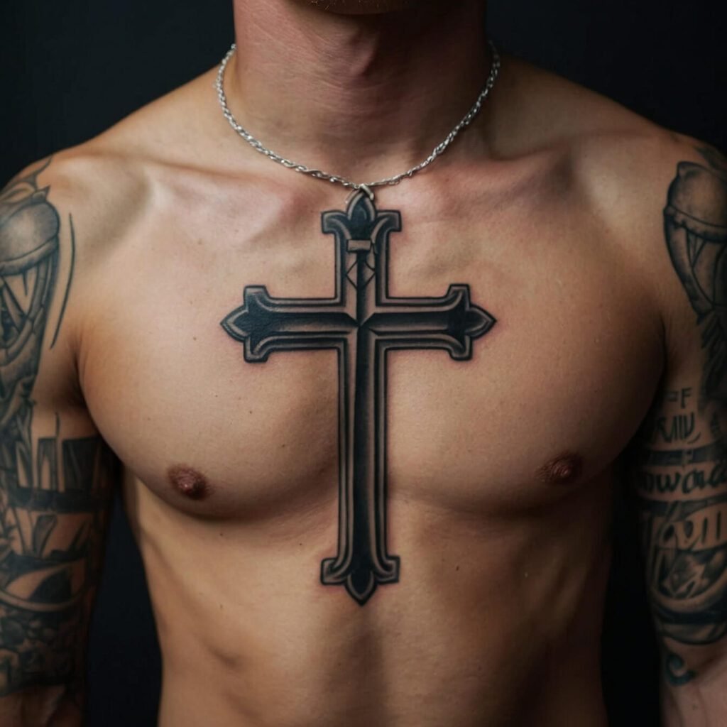 If you’re drawn to bold, edgy designs, a tribal cross is a perfect choice. With its sharp angles and strong lines, this tattoo makes a powerful statement. The tribal cross combines traditional symbolism with a modern, dynamic look. I love how it stands out on the chest, creating a striking visual impact.