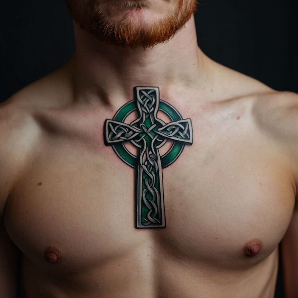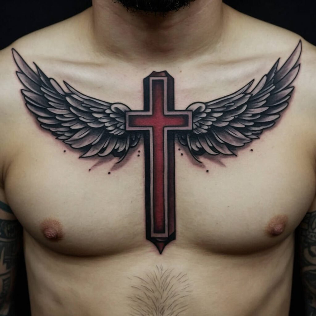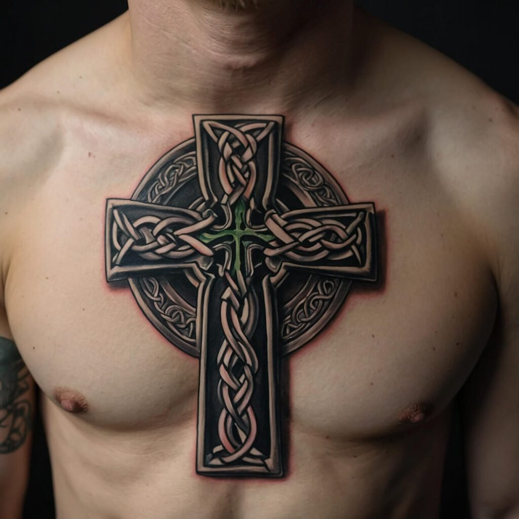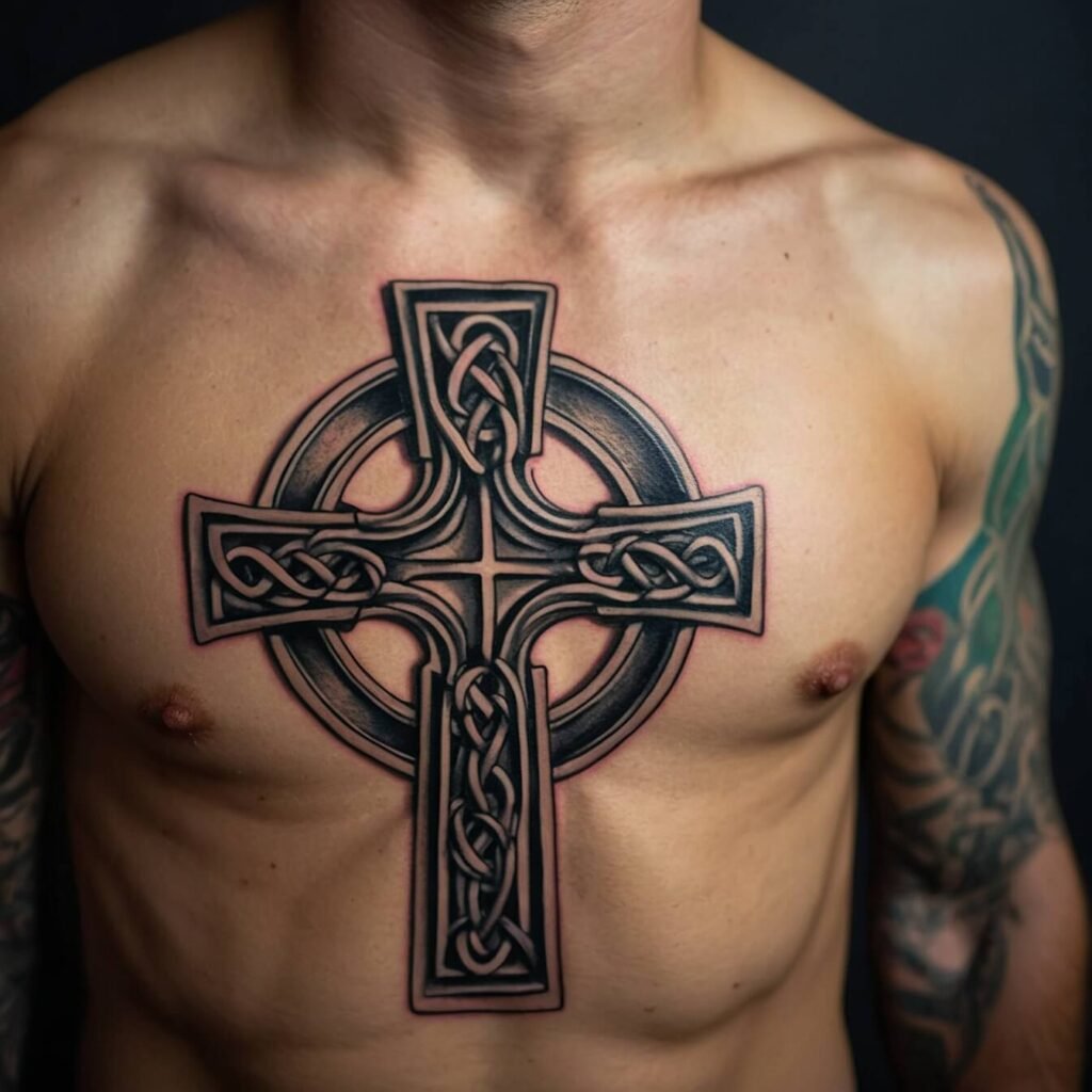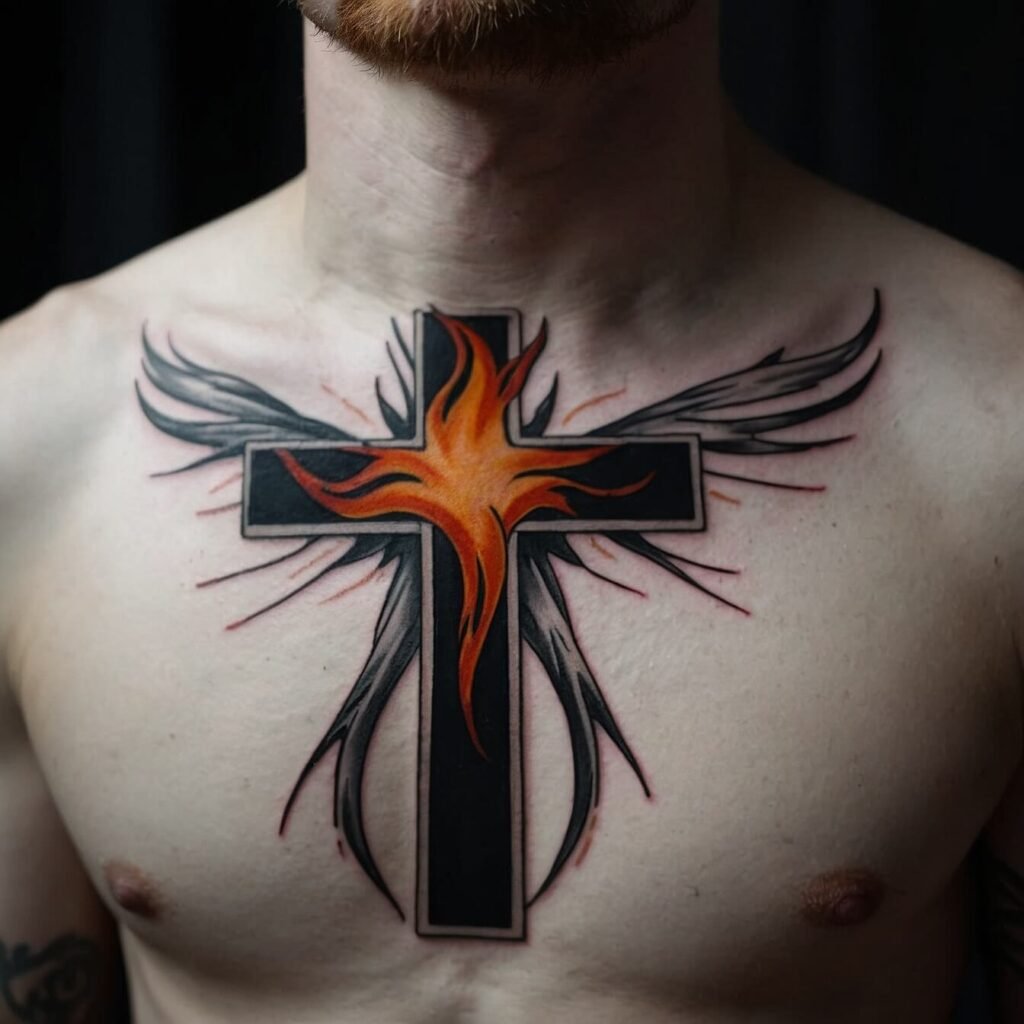 If you’re drawn to bold, edgy designs, a tribal cross is a perfect choice. With its sharp angles and strong lines, this tattoo makes a powerful statement. The tribal cross combines traditional symbolism with a modern, dynamic look. I love how it stands out on the chest, creating a striking visual impact.