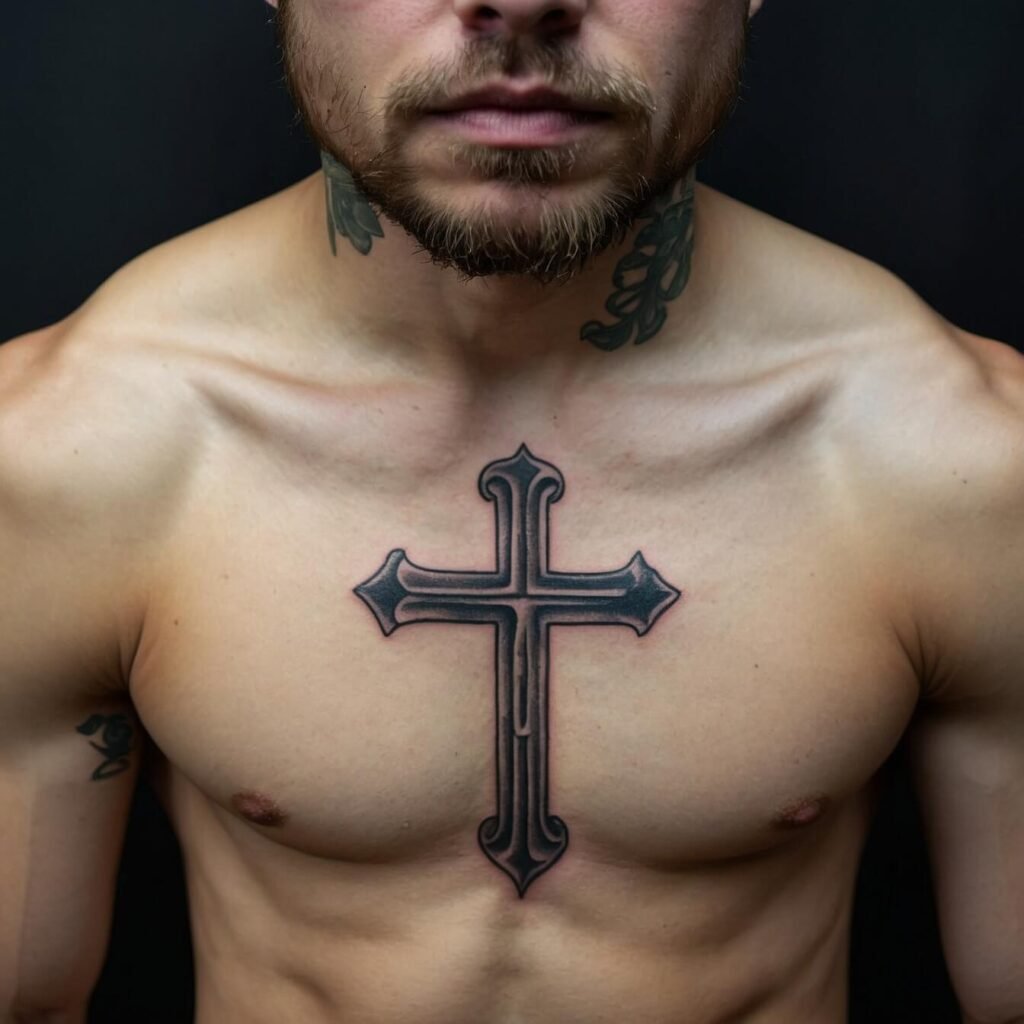 A cross tattoo on the chest often symbolizes faith, protection, and strength. Placing it on the chest or half chest signifies keeping these values close to the heart. It can also represent personal transformation and spiritual journey, showing resilience and commitment. The chest’s central position highlights the tattoo’s importance, making it a powerful reminder of what you hold dear and a bold statement of your beliefs.