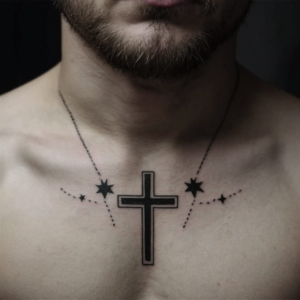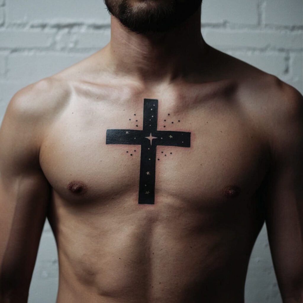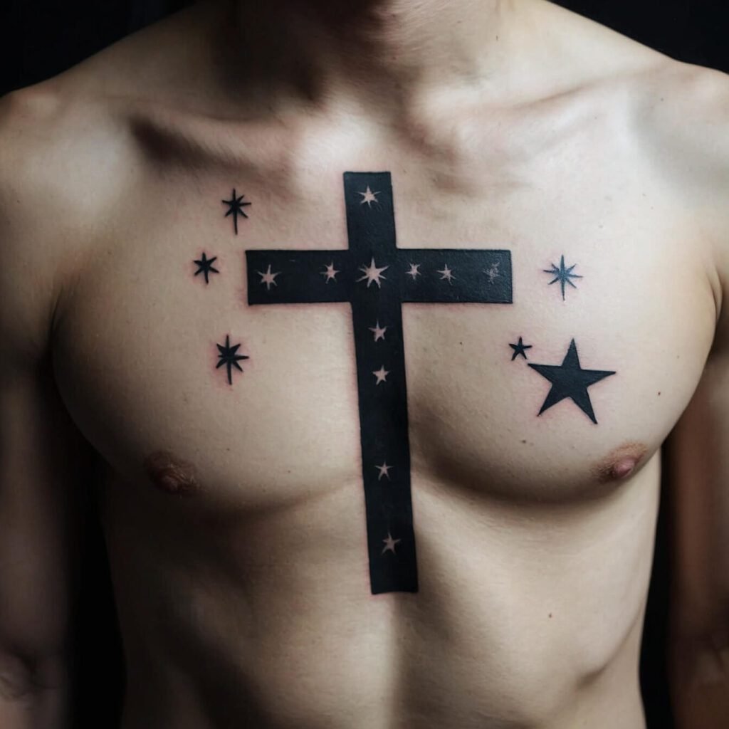 For a celestial twist on a classic design, consider a cross adorned with small stars. This tattoo combines the timeless symbol of faith with a touch of cosmic wonder. Each star adds a hint of brightness, turning your chest into a canvas of subtle elegance.