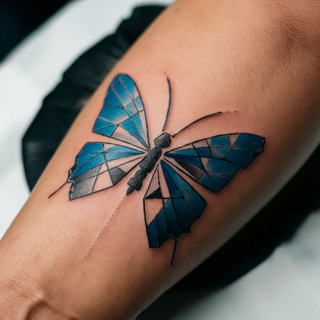 Personalized Description: A butterfly, not in typical wings, but through abstract geometric shapes, filled with shades of blue. It’s a modern take on a classic symbol.