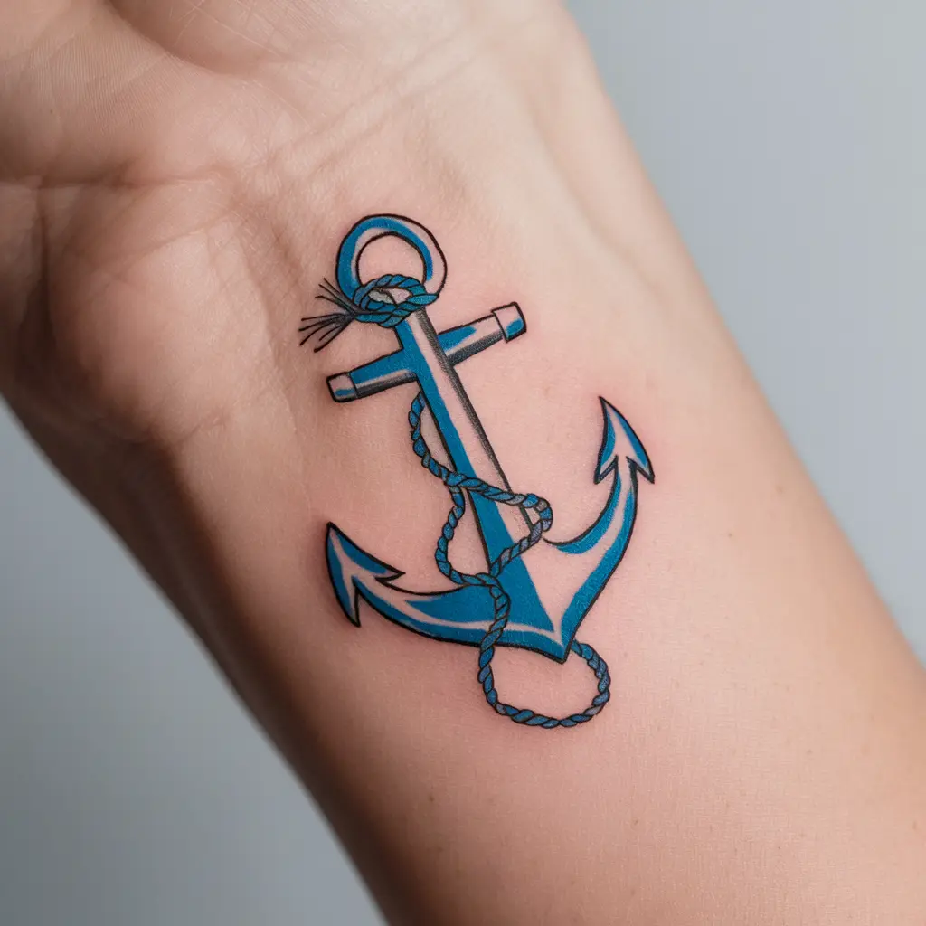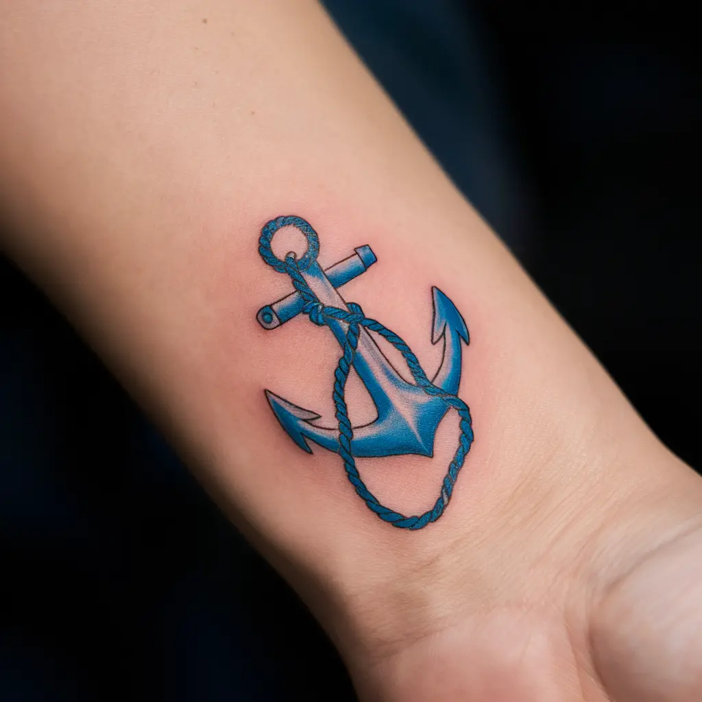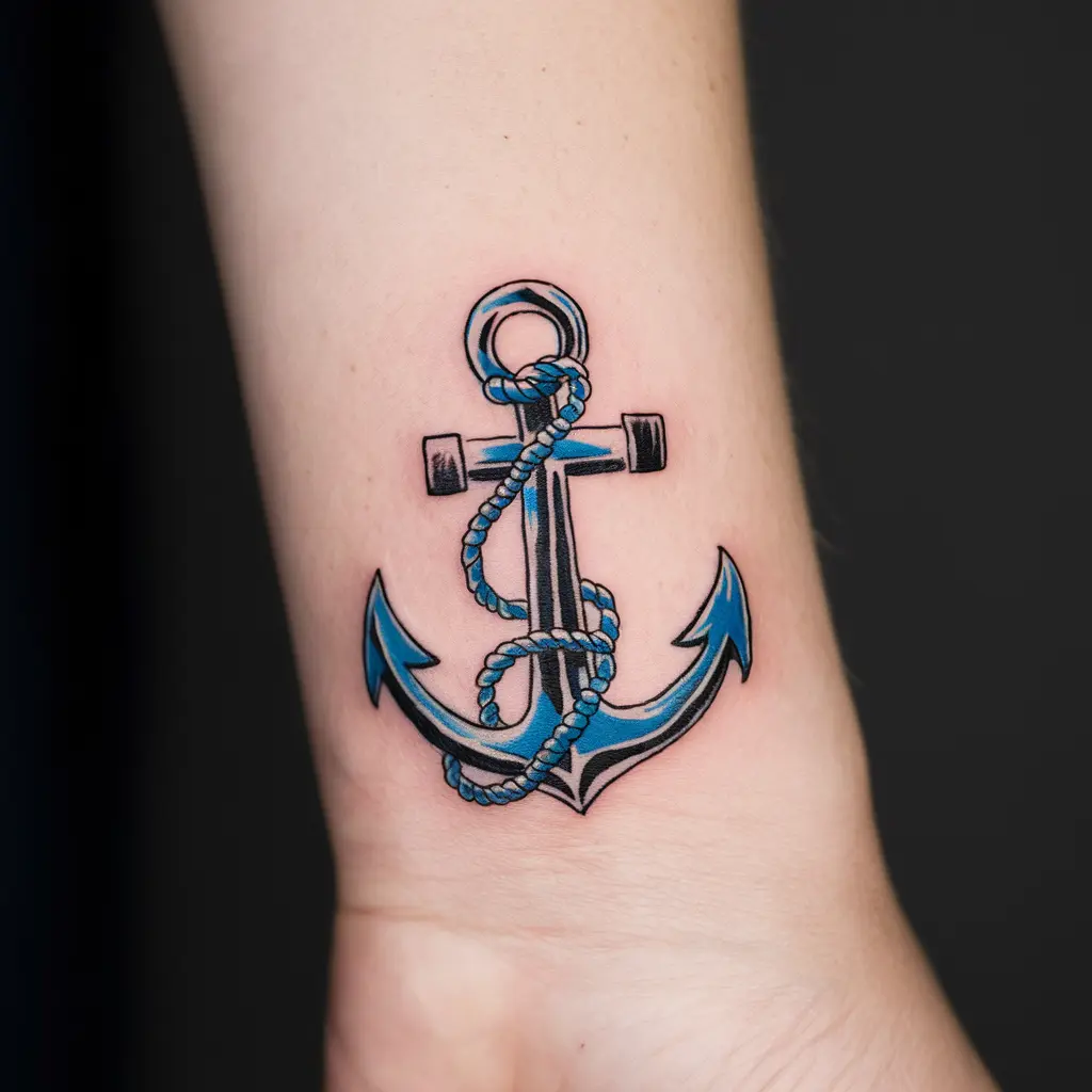 Tattoo Meaning: The anchor symbolizes stability, hope, and grounding. The blue adds calmness and the connection to the sea.