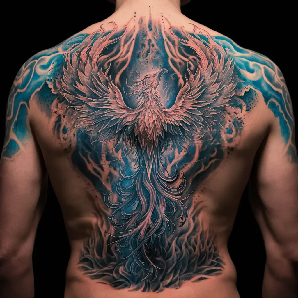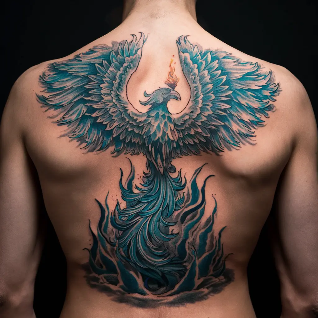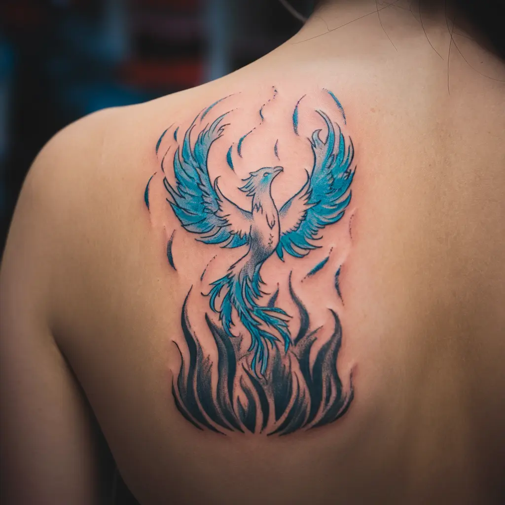 Tattoo Meaning: The phoenix is a symbol of immortality, rebirth, and strength. The blue adds a layer of calmness and mystery.