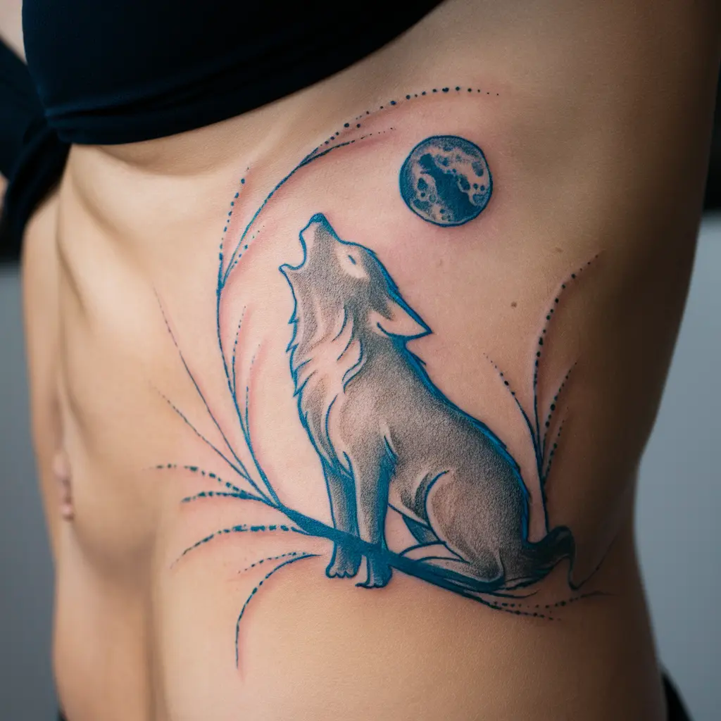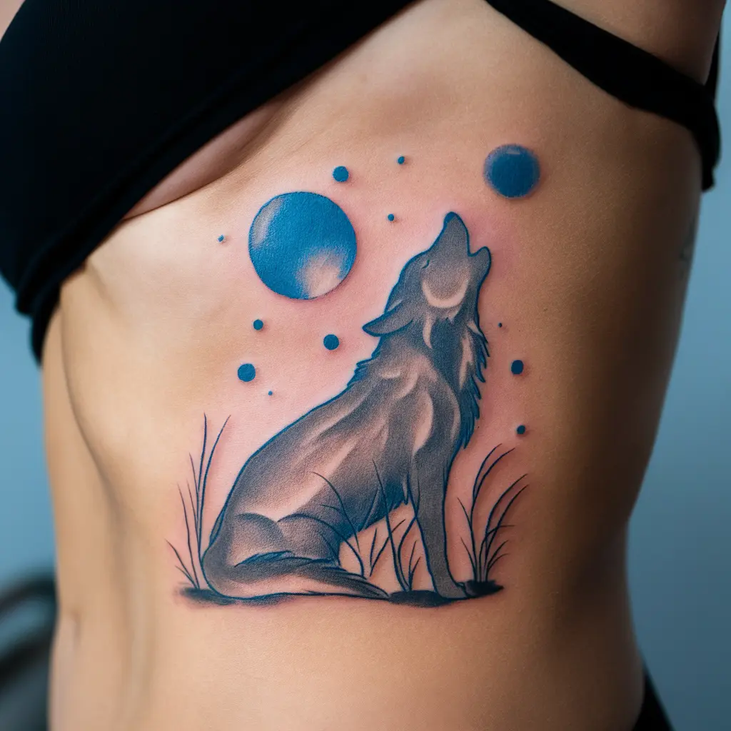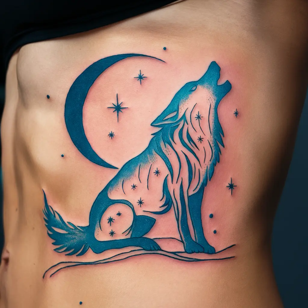 Tattoo Meaning: Wolves symbolize loyalty, courage, and freedom. The moon adds mystery, while the blue ink enhances the feeling of night and wildness.