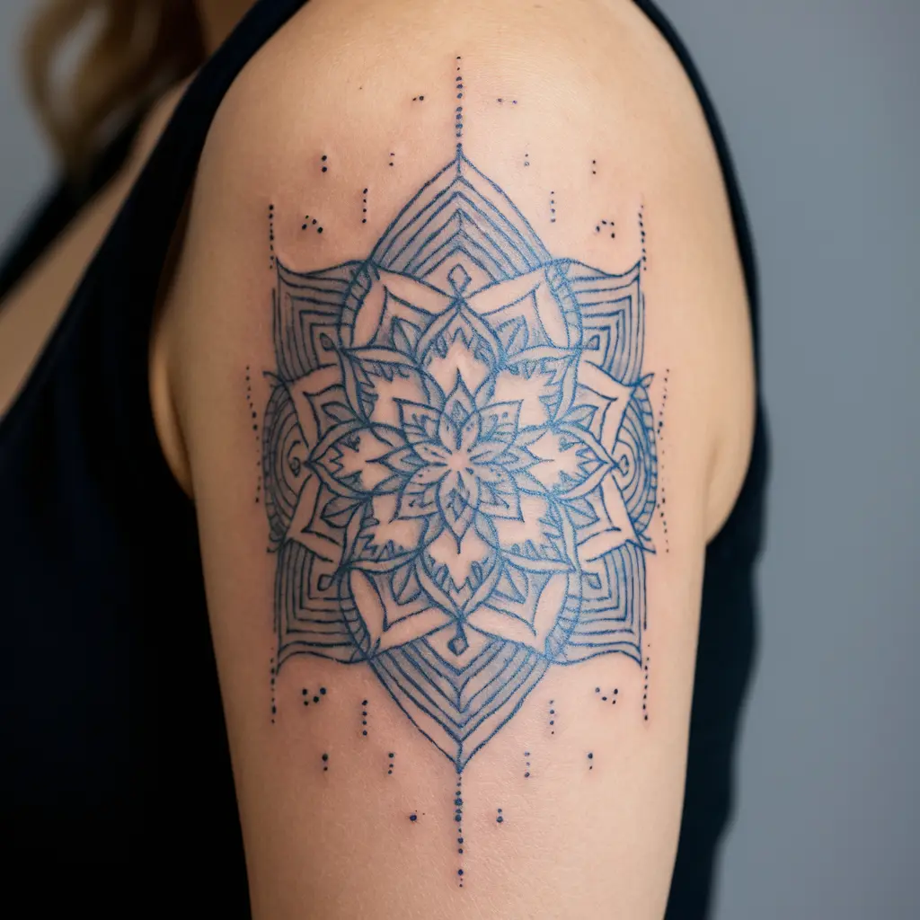 Tattoo Meaning: Mandalas symbolize unity, harmony, and the universe. The blue hue deepens the feeling of peace and meditation.