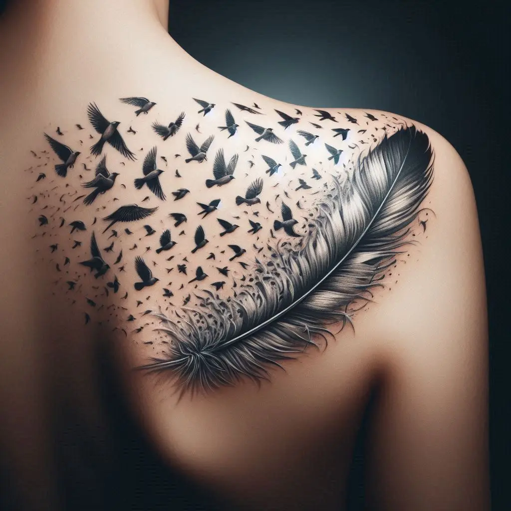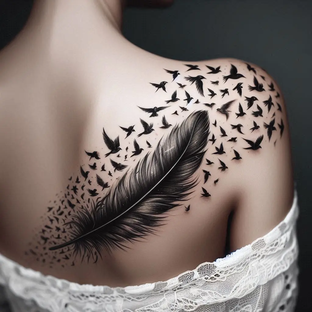 Tattoo Meaning: Feathers symbolize freedom, lightness, and spiritual growth, while birds represent liberation.