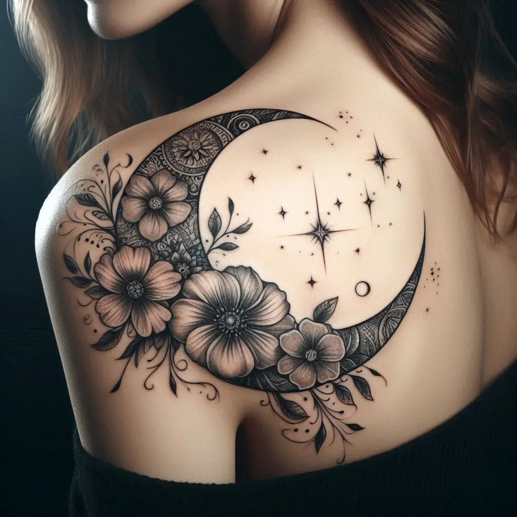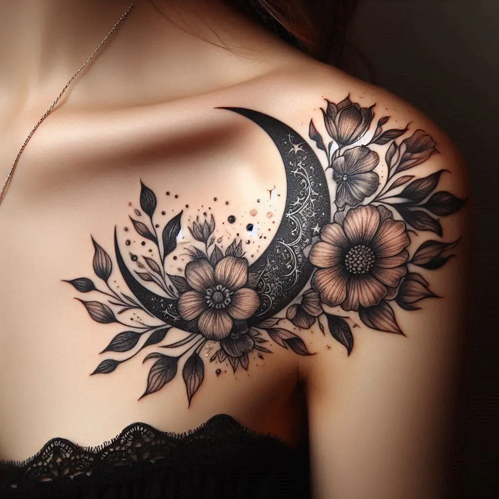Tattoo Meaning: The crescent moon often represents growth, intuition, and feminine energy, while flowers add beauty and growth.